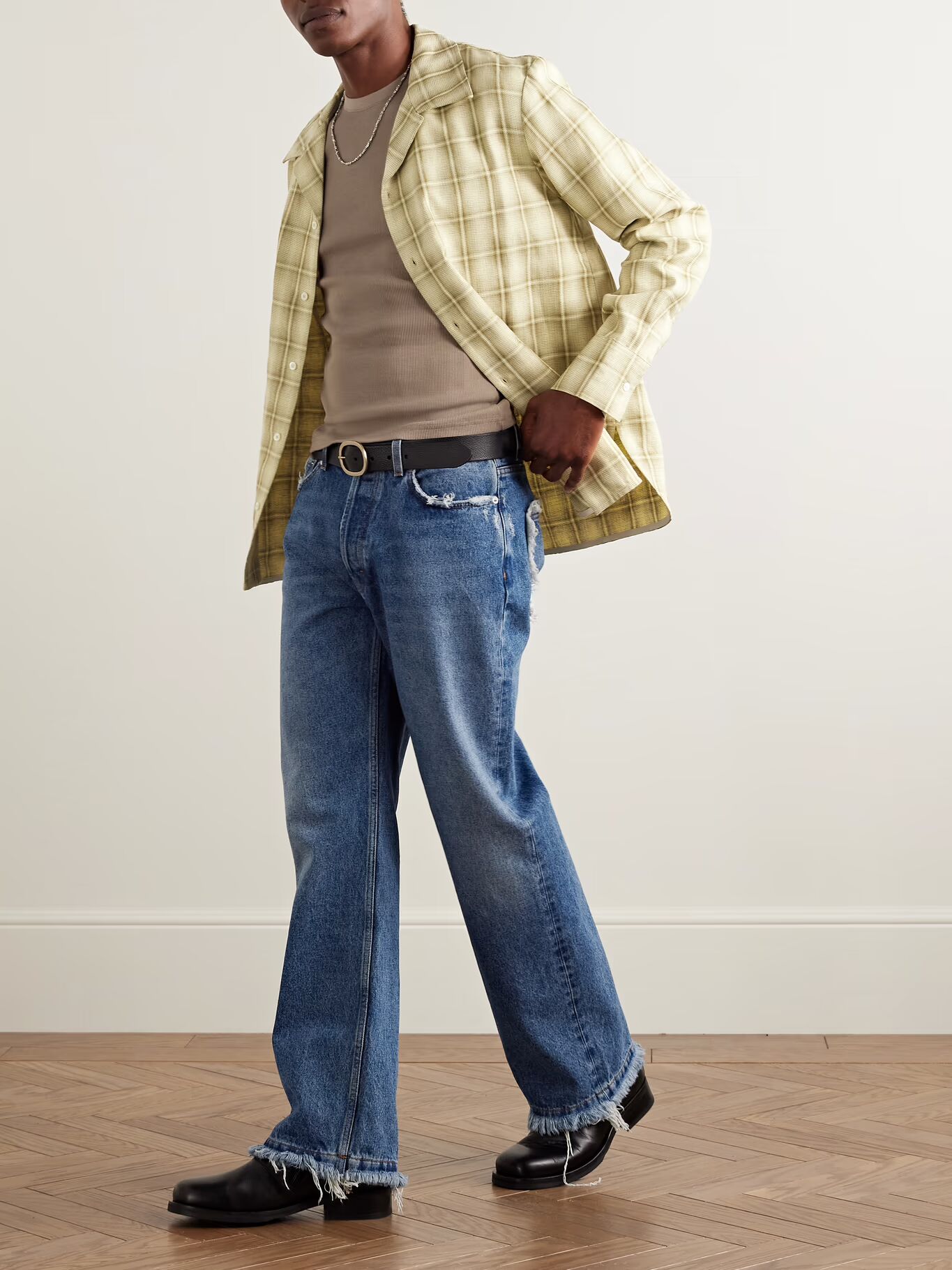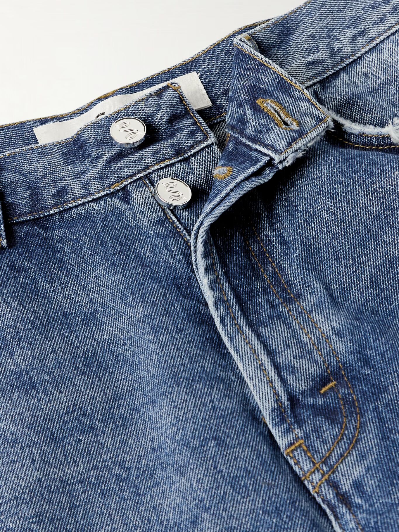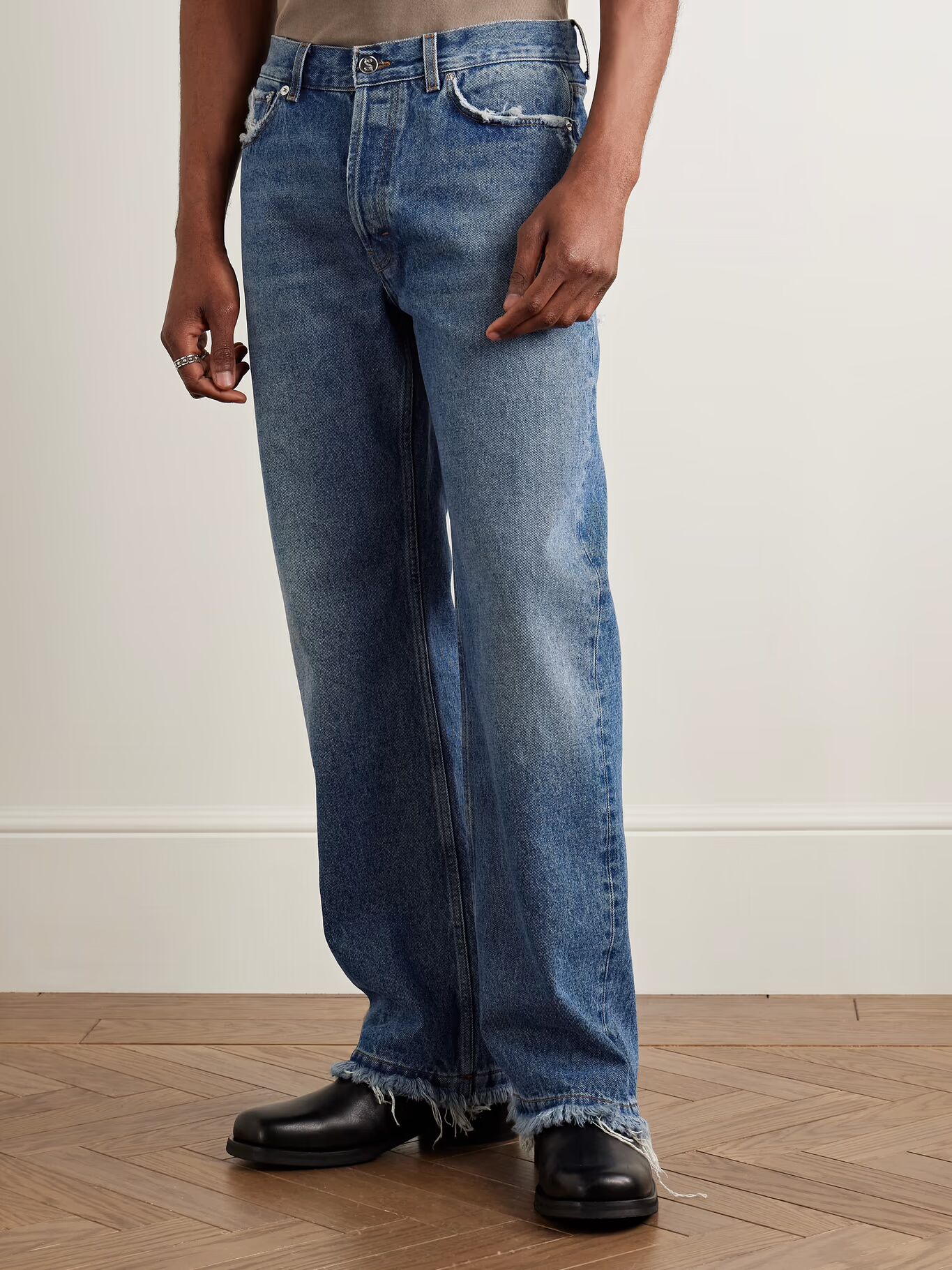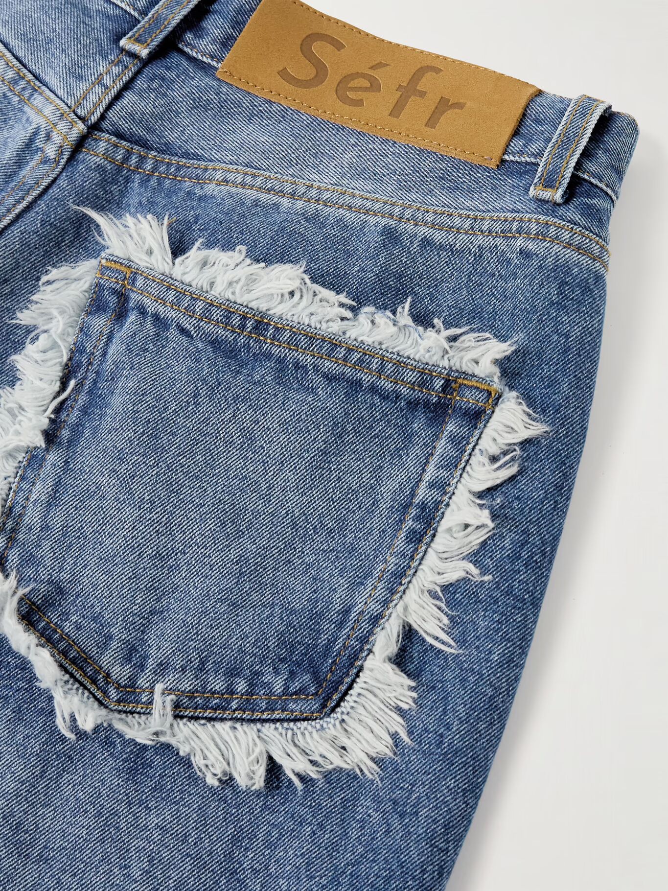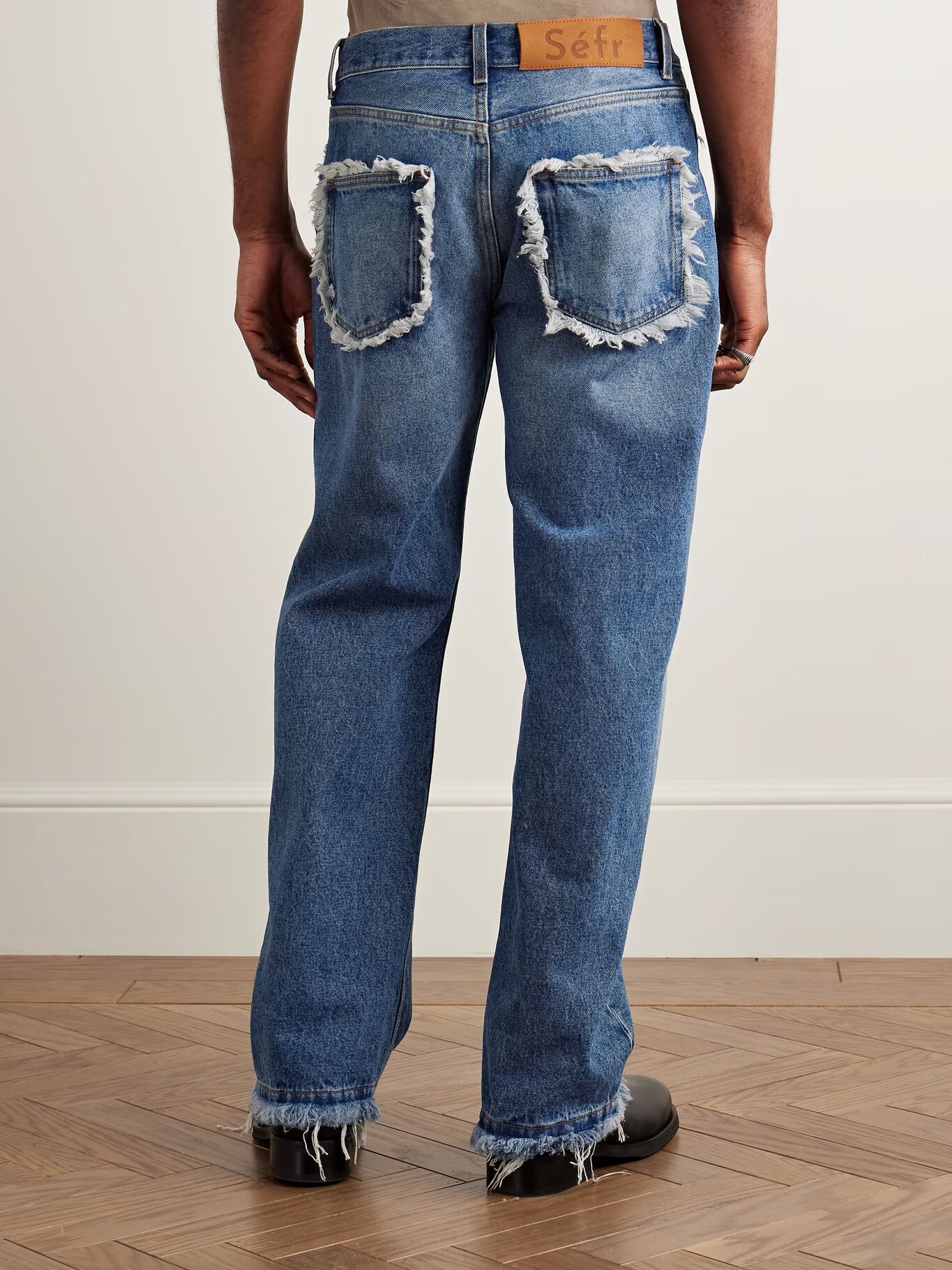 Джинсы Сефра выцветшие и потертые, напоминают поношенную любимую вещь. Сшитые из классического синего денима, они имеют прямые штанины и конструкцию с пятью карманами — те, что сзади, потерты сильнее всего.