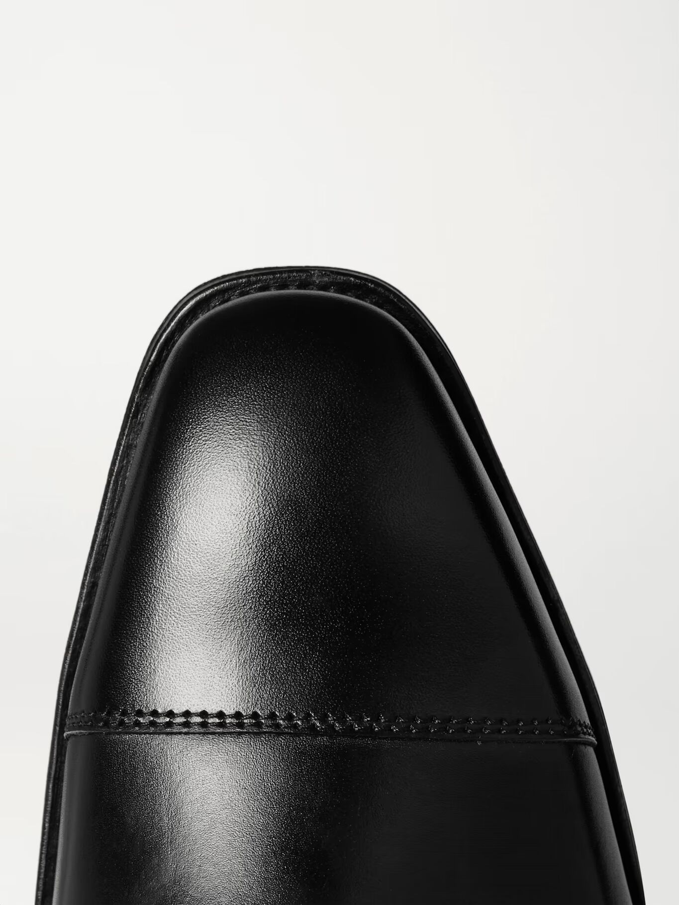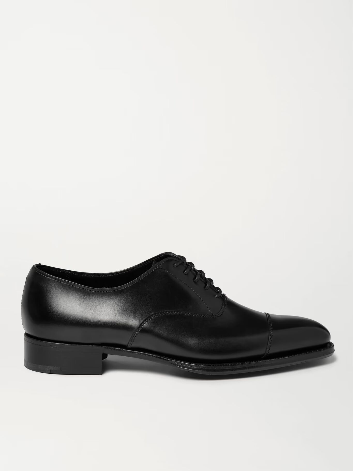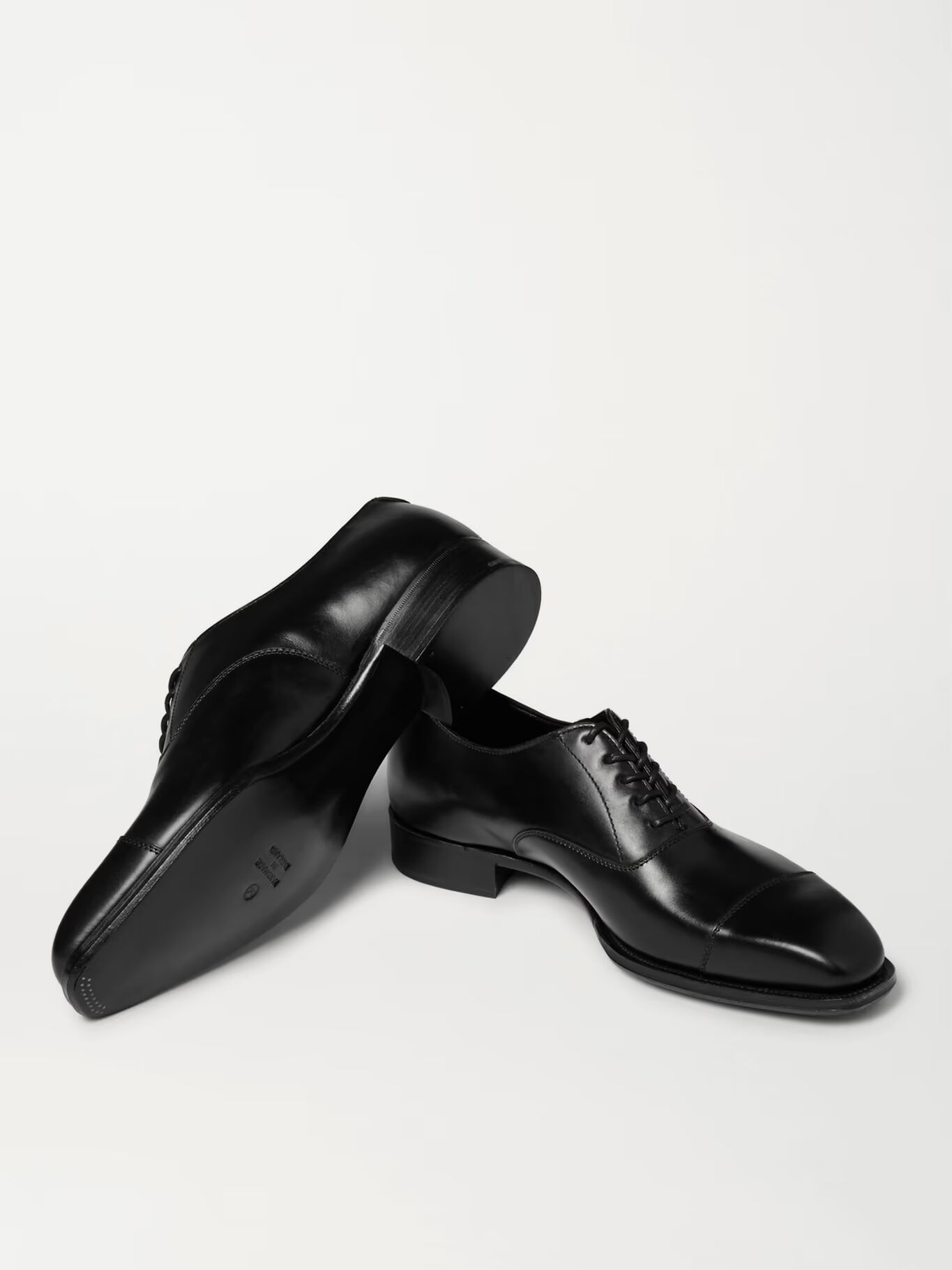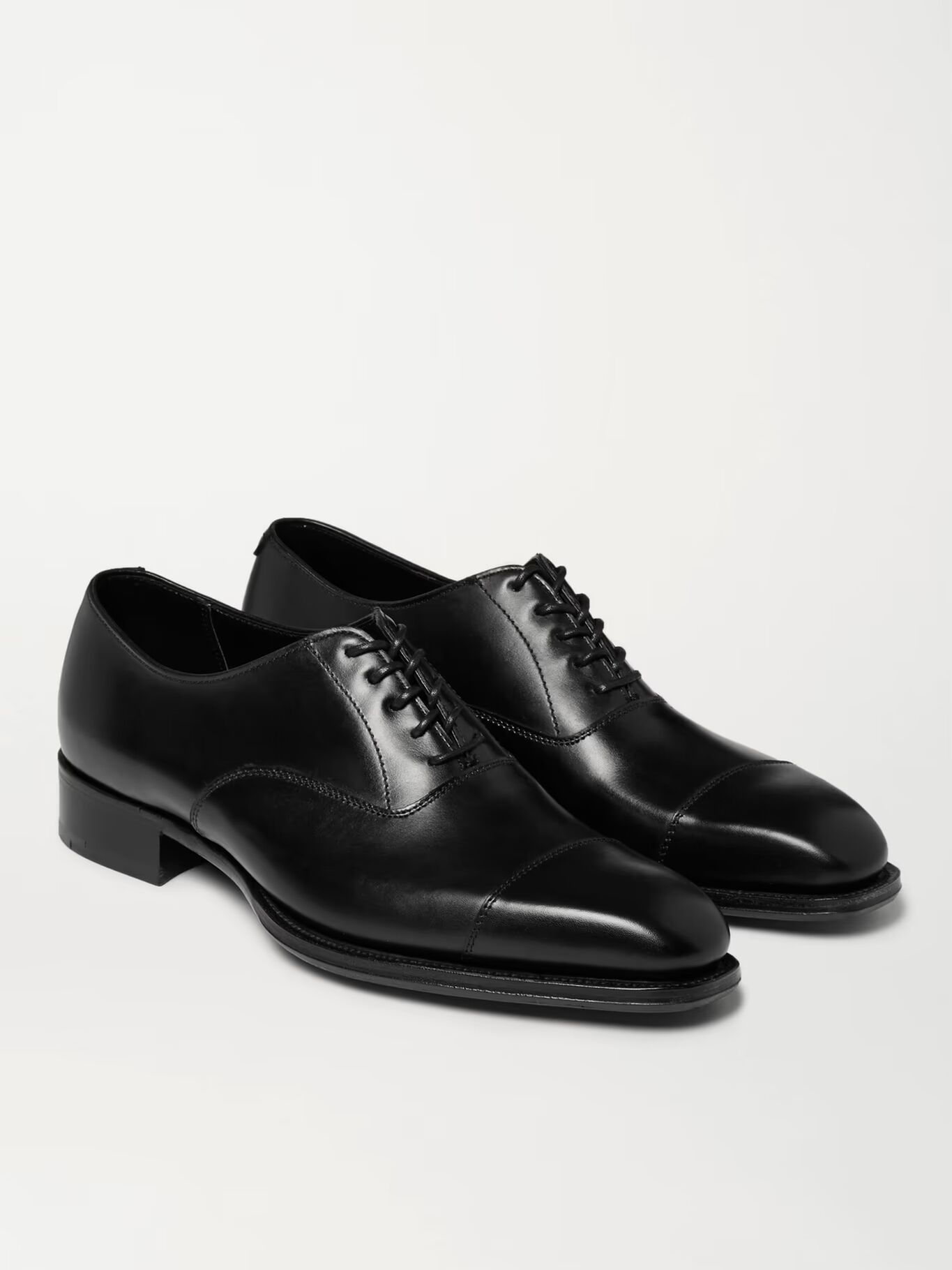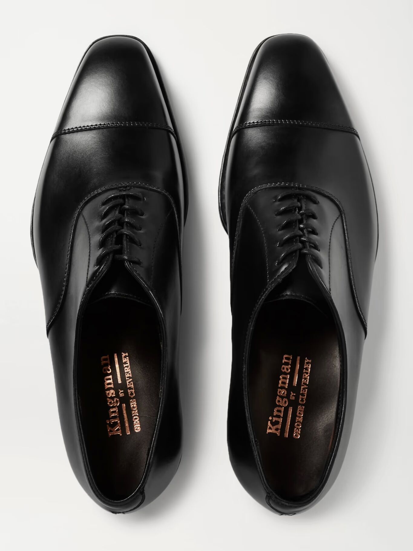 Изготовленные по заказу Kingsman Джорджем Клеверли — любимым сапожником сэра Уинстона Черчилля — эти черные кожаные оксфордские туфли воплощают квинтэссенцию британского стиля. Безупречно отделанная вручную в Англии с характерной миндалевидной формой носка, эта гладкая пара прослужит вам долгие годы. Носите их с четко скроенным костюмом и свежими хлопковыми носками. Здесь показаны с рубашкой Kingsman, костюмом Kingsman, запонками Kingsman, нагрудным платком Kingsman, галстуком Kingsman.