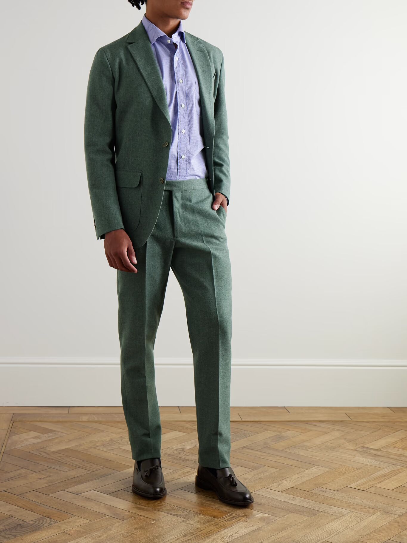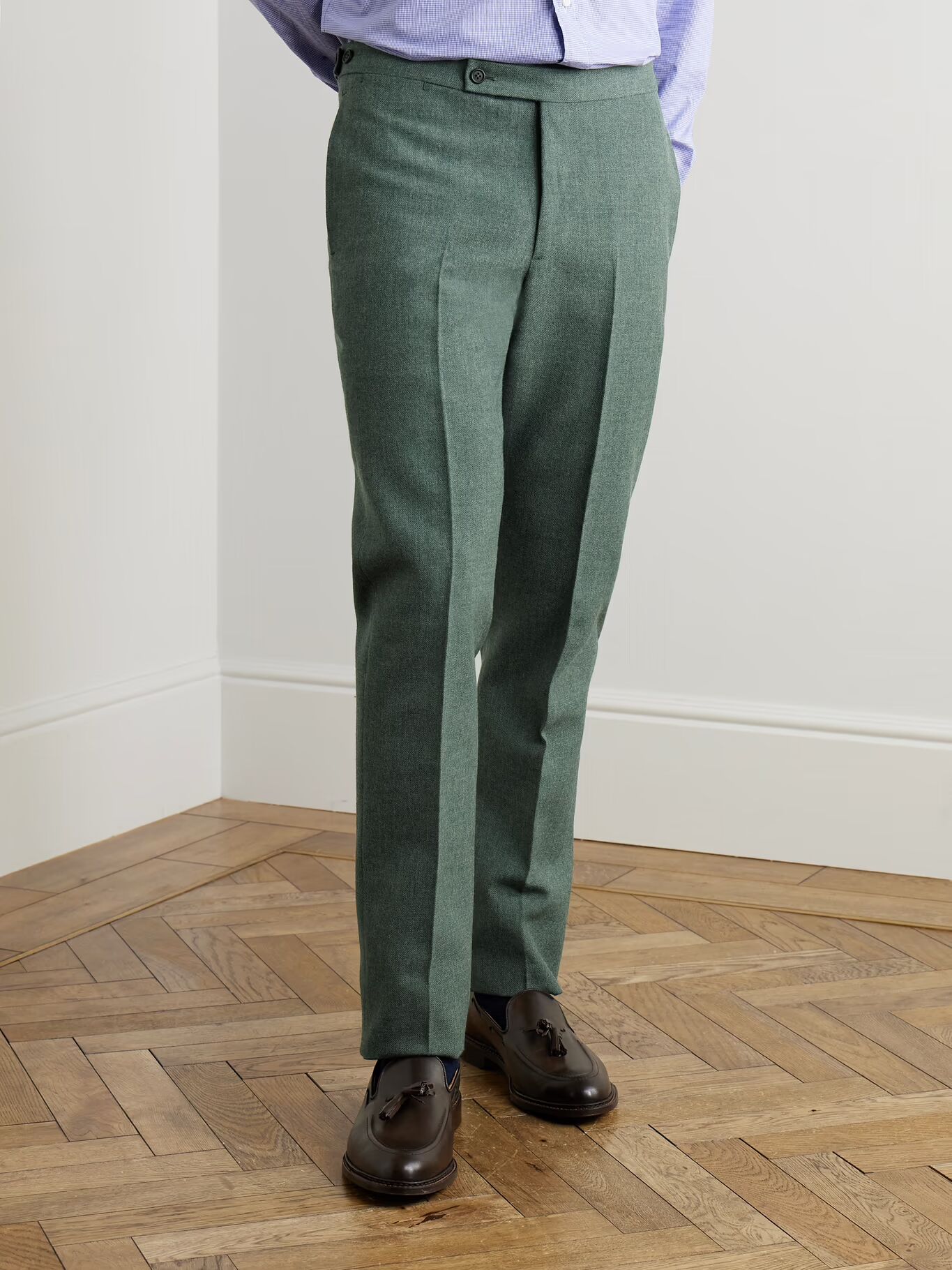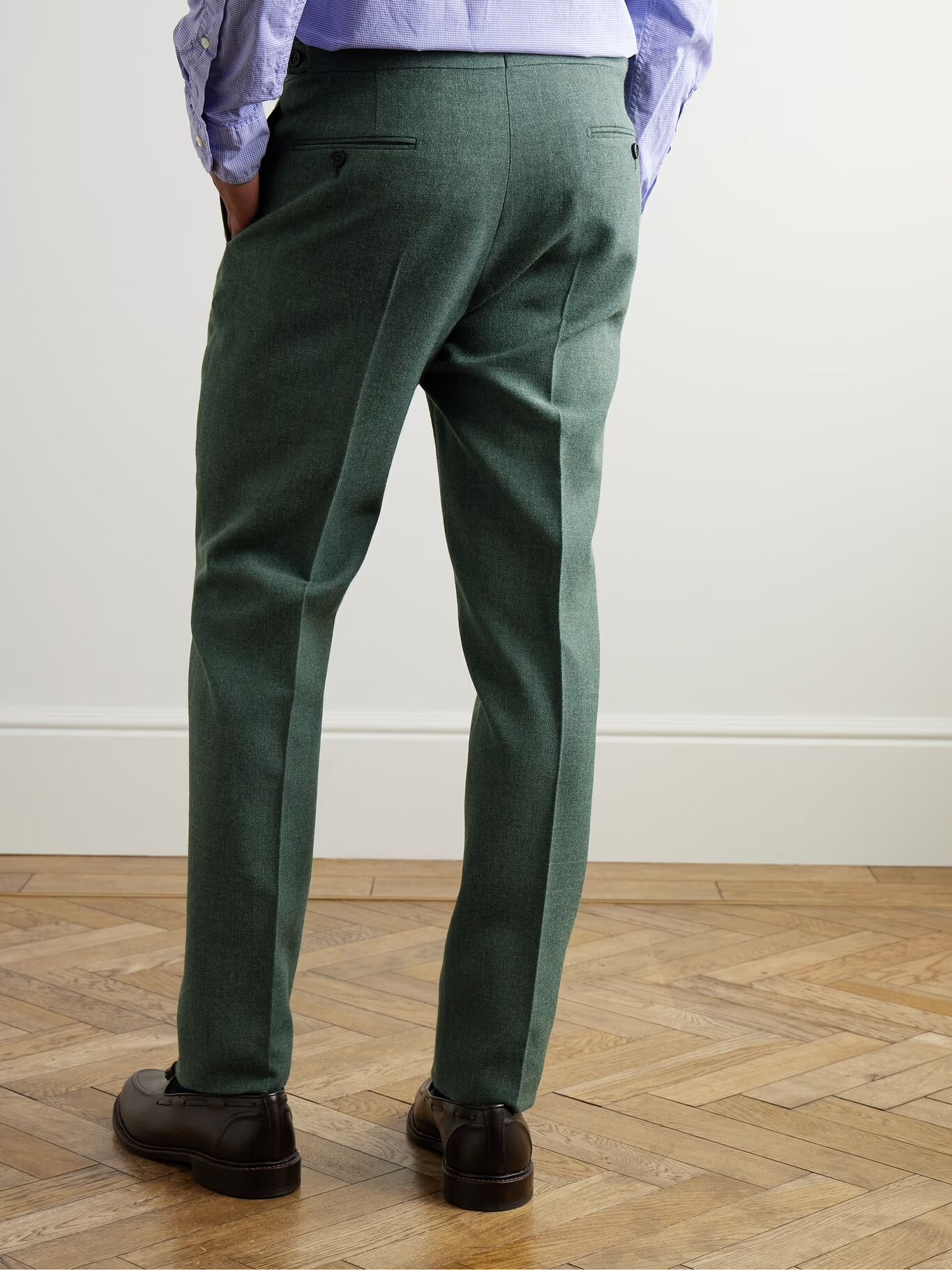 Шерсть, используемую для этих брюк, Сид Машберн закупил на семейной фабрике в Западном Йоркшире, дав ей простоватое название «Meadow Country Cloth». Они сшиты в облегающем стиле с обтекаемыми складками вдоль штанины и имеют хлястики на талии, поэтому вы можете отказаться от ремня.