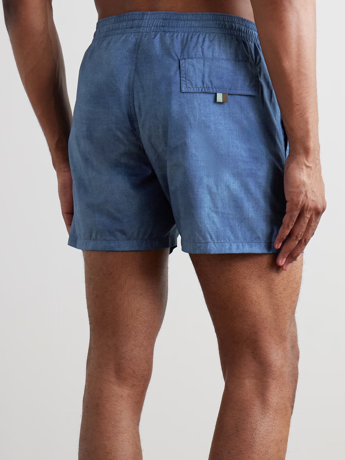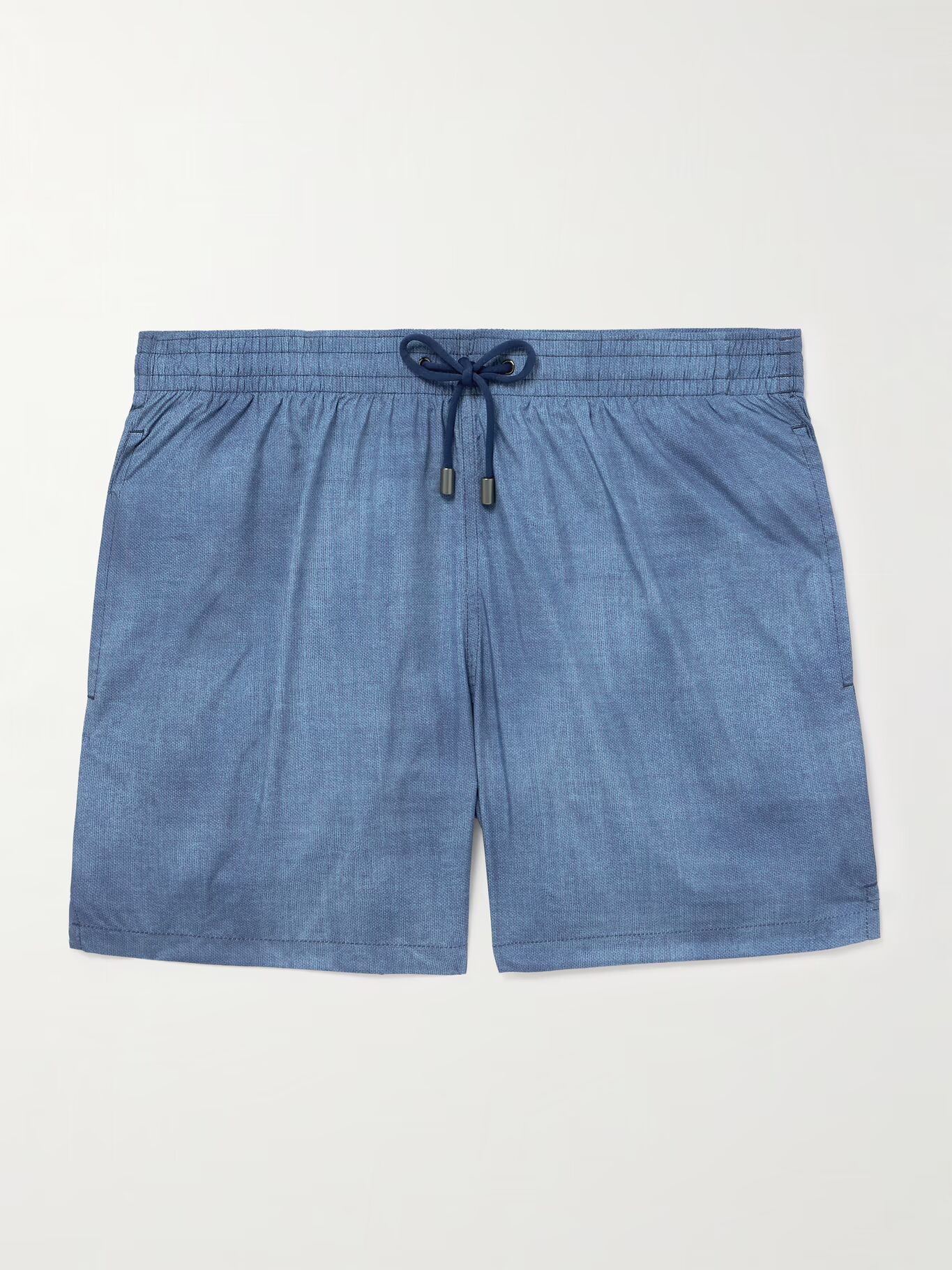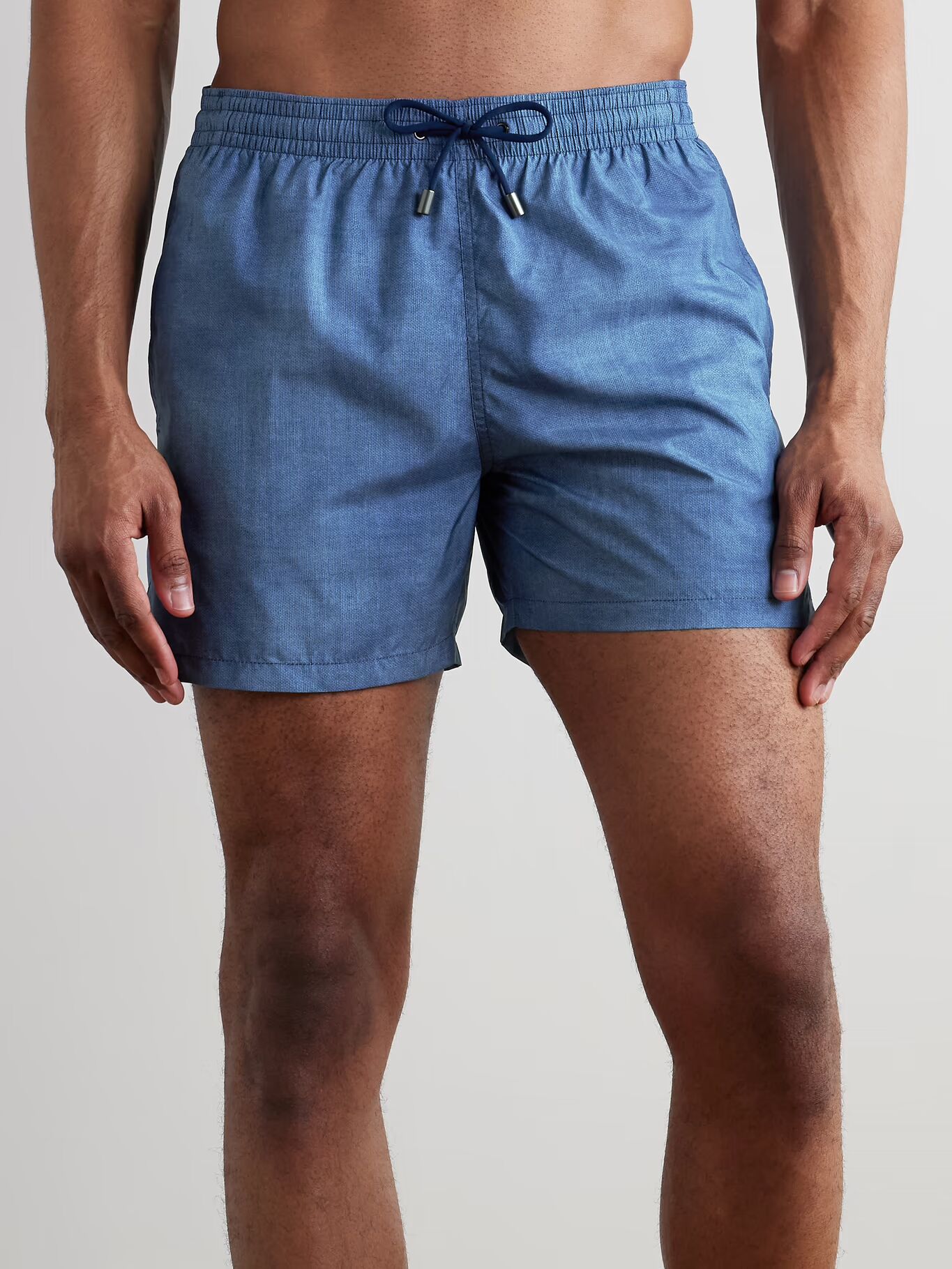 Плавки Canali имеют едва заметный принт, который выглядит как тканая ткань. Они сделаны в Италии из быстросохнущей оболочки и имеют задний карман с магнитной застежкой, куда можно положить ключ от номера.