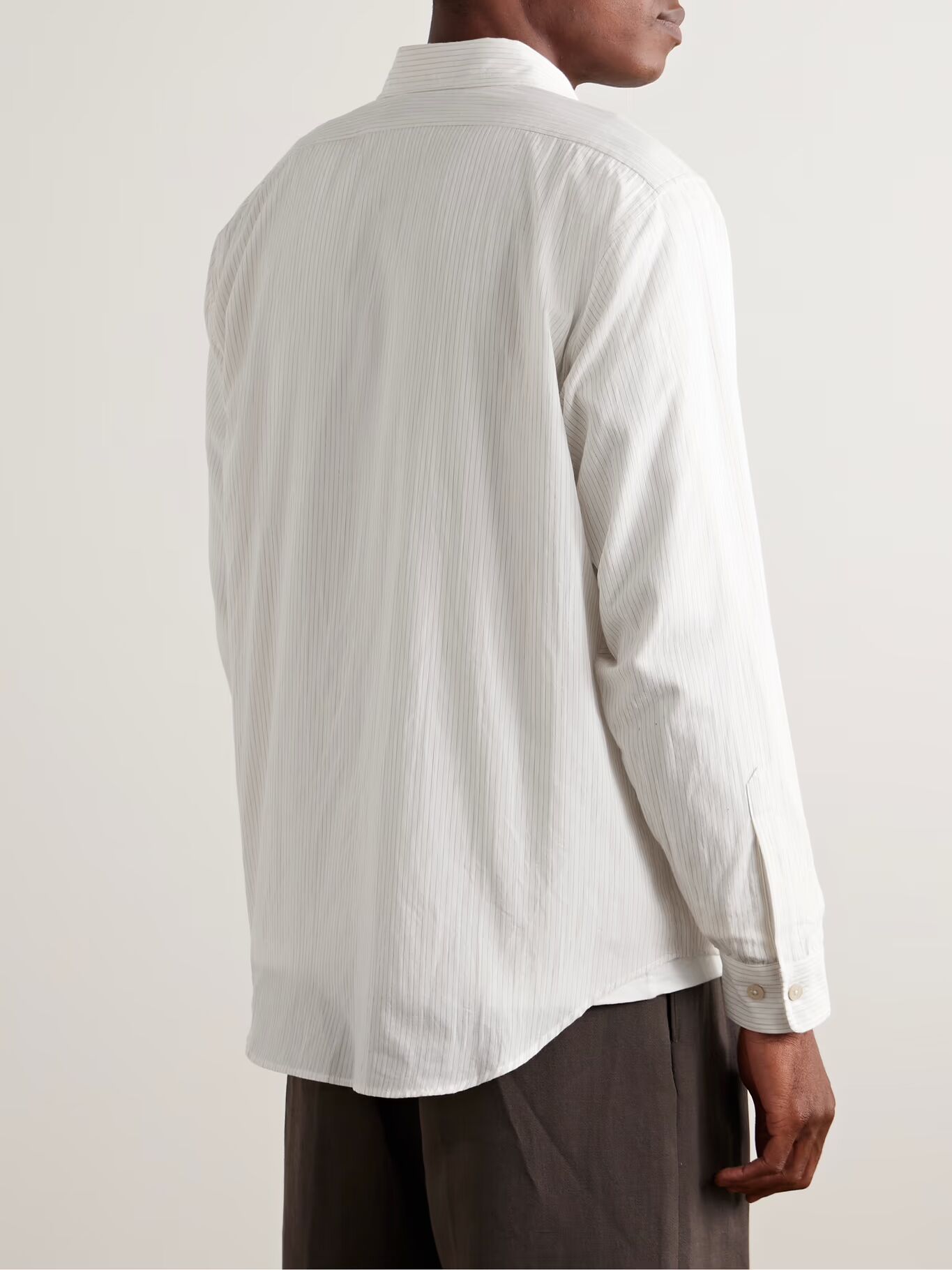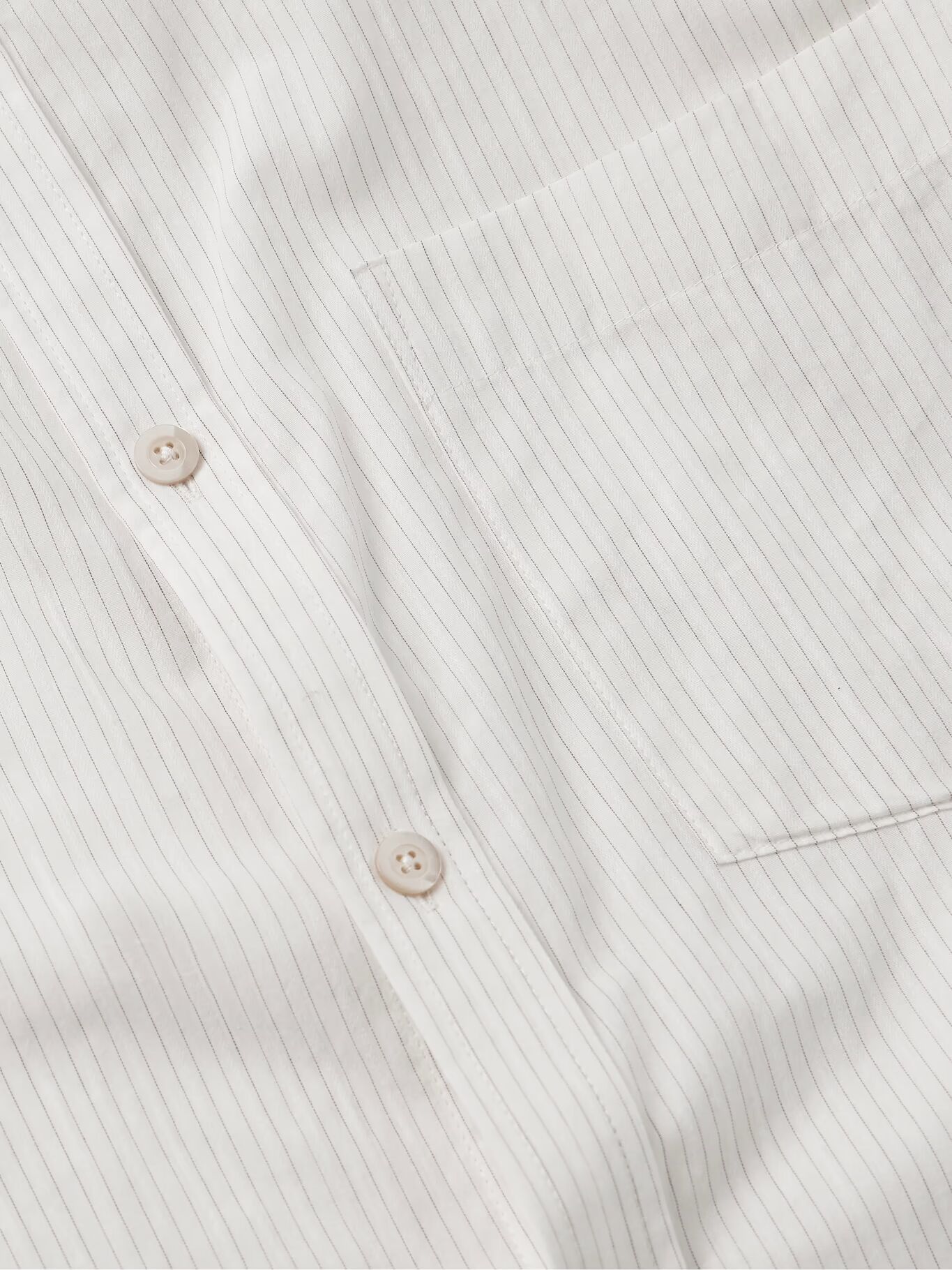 Рубашка Small Talk сделана из легкой японской хлопчатобумажной вуали с узором из тонких полосок. Она рассчитана на свободную посадку, имеет изогнутый подол и застегивается на пуговицы-ракушки.