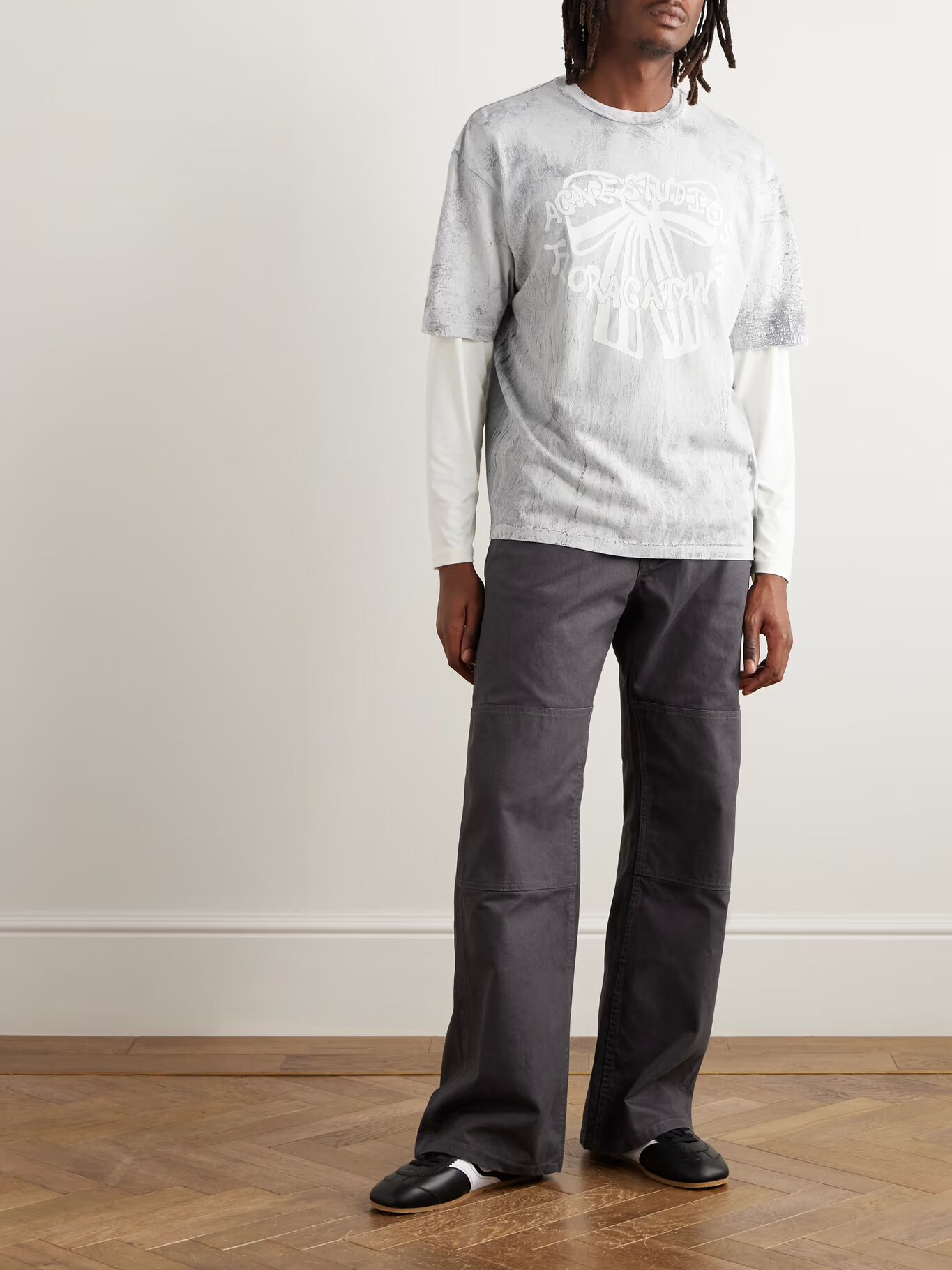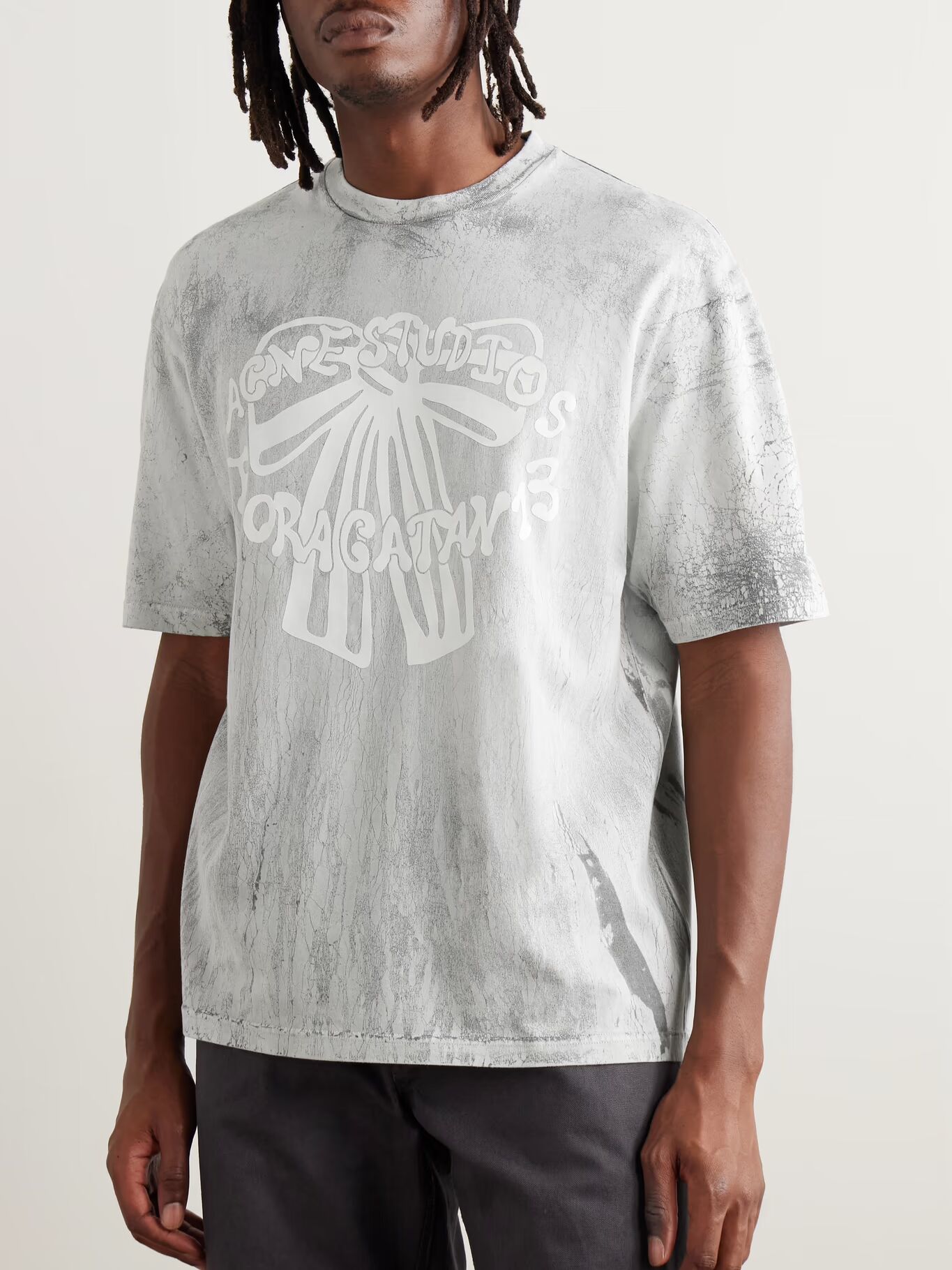 Футболка Acne Studios напечатана с бантом и адресом шведской штаб-квартиры бренда. Она сшита из легкого хлопкового трикотажа в слегка свободном крое, который выглядит так, будто ее оштукатурили, что придает каждому изделию уникальный вид.