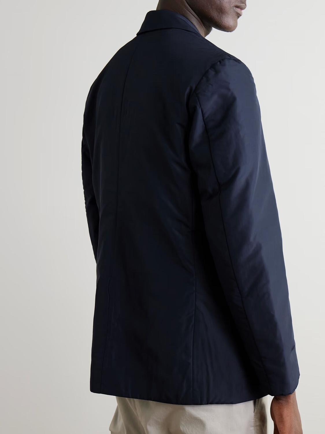 СОЗДАН Г-НОМ ПОРТЕРОМ. Редко можно увидеть блейзер из оболочки — обычно эта ткань используется для технической верхней одежды. Стиль г-на П. находится где-то посередине между ними, с его водонепроницаемой отделкой и легкой подкладкой.