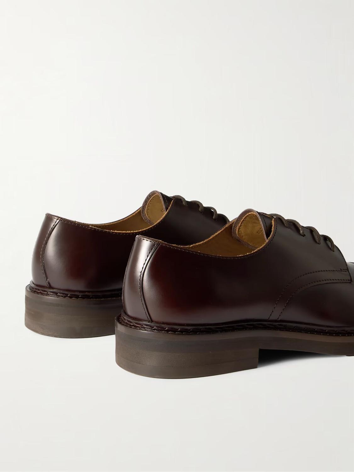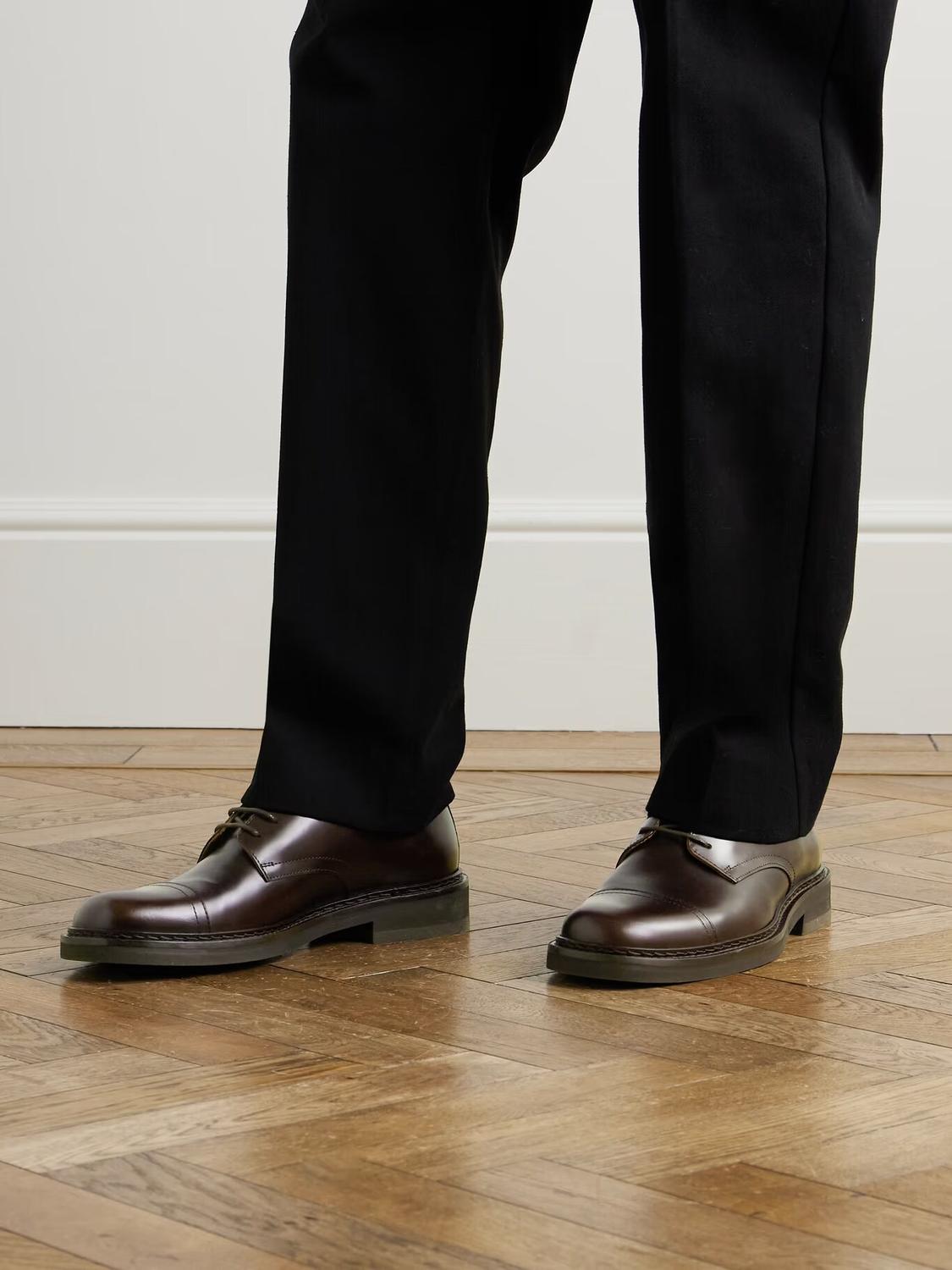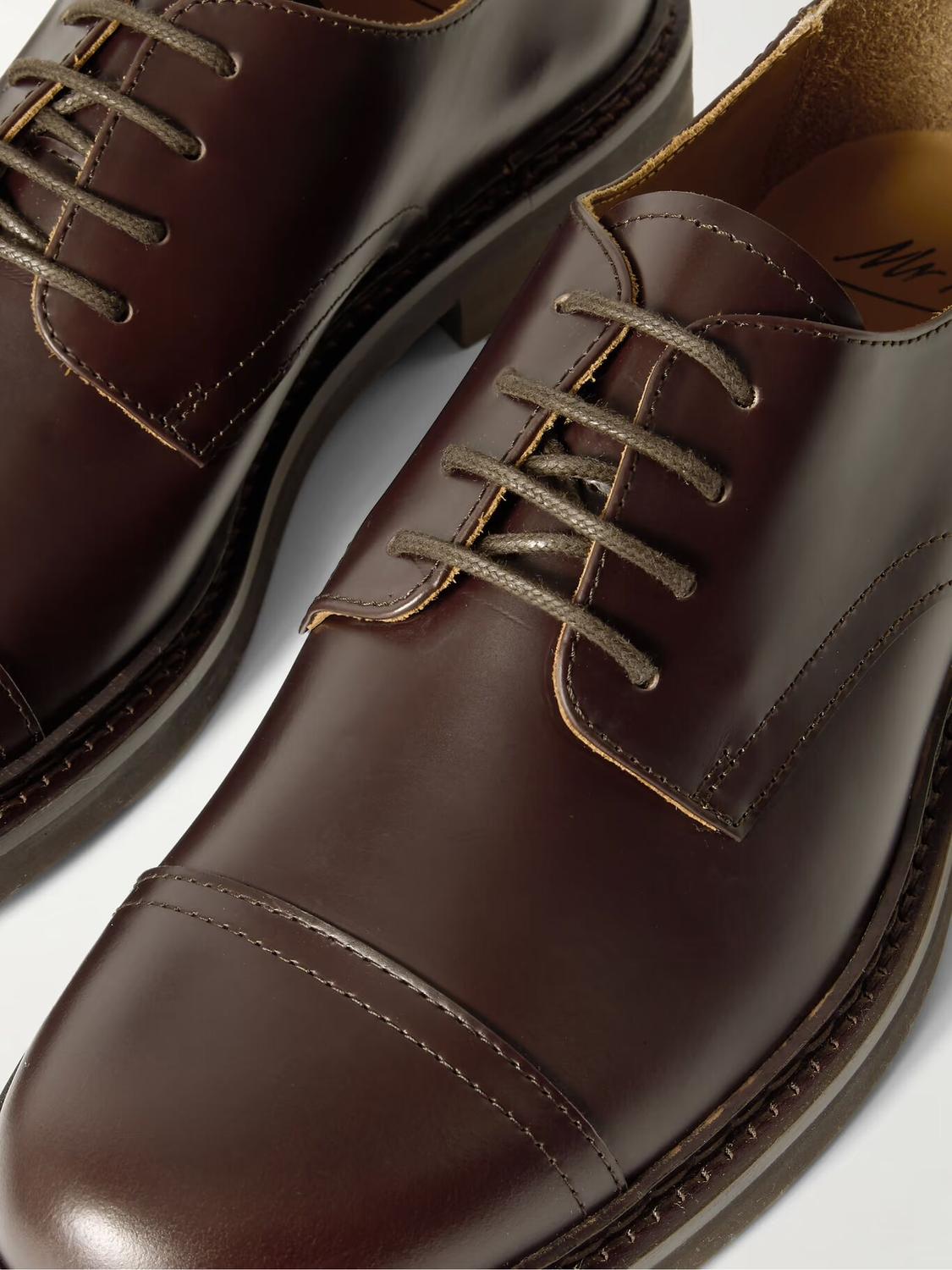 СОЗДАНО Г-НОМ ПОРТЕРОМ. Минимальная детализация на туфлях дерби «Жак» г-на П. позволяет качеству и мастерству выйти на первый план. Они сделаны из блестящей кожи и установлены на прочные подошвы Vibram. Аккуратная отстрочка на носках завершает вневременной дизайн.