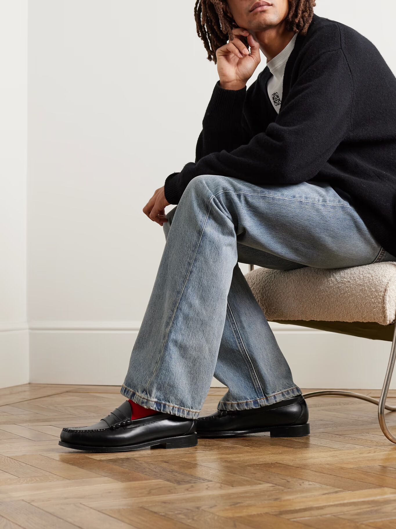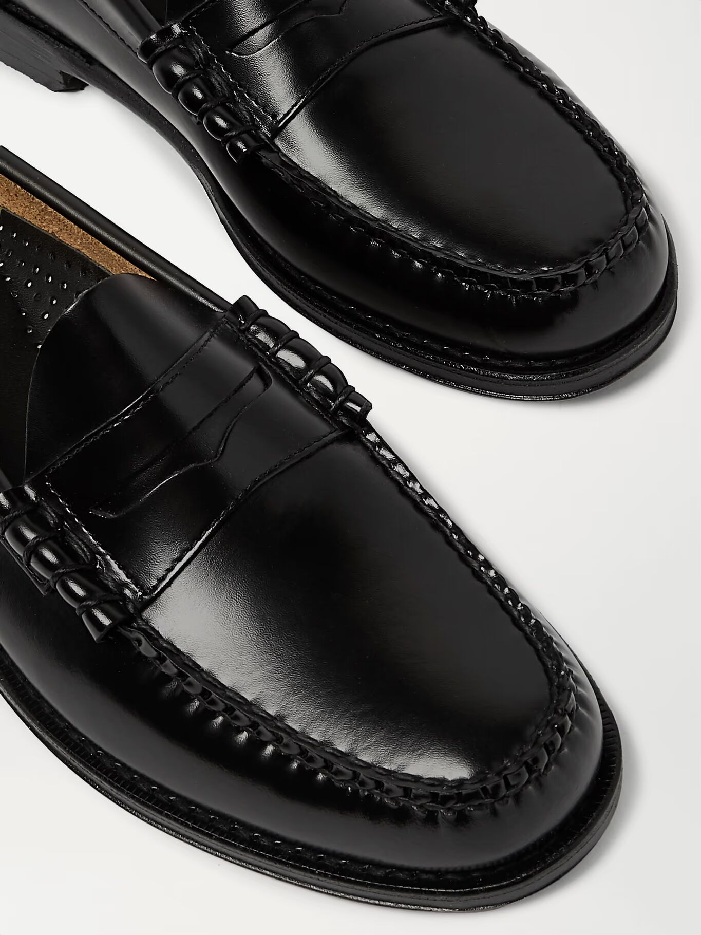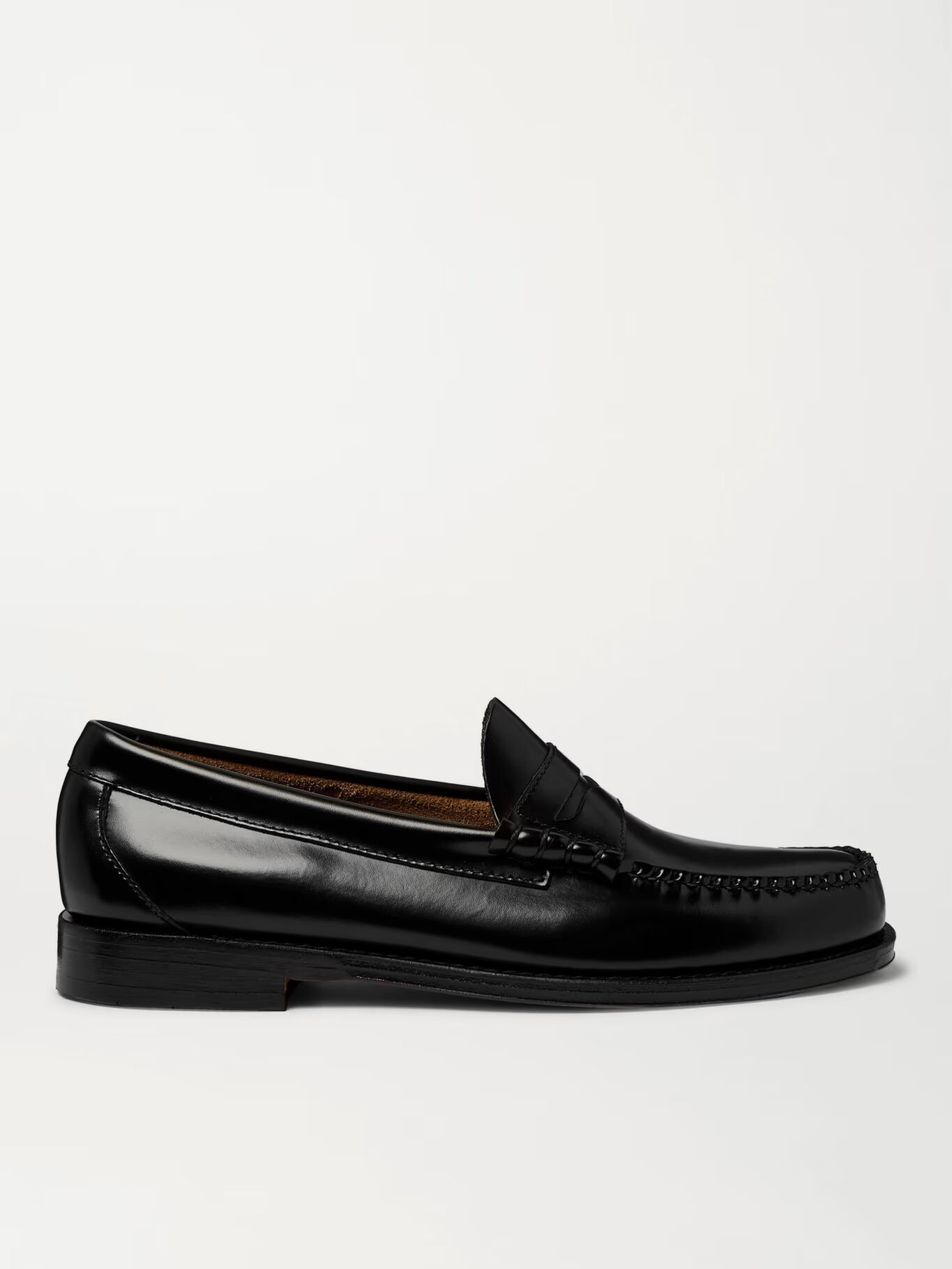 Вдохновленный традиционными туфлями-слайдерами норвежских рыбаков, Джордж Генри Басс создал первую пару пенни-лоферов еще в 1930-х годах. Они сделаны из гладкой черной кожи, имеют прочные швы, прошитые вручную, и подошвы с резиновой отделкой для сцепления.