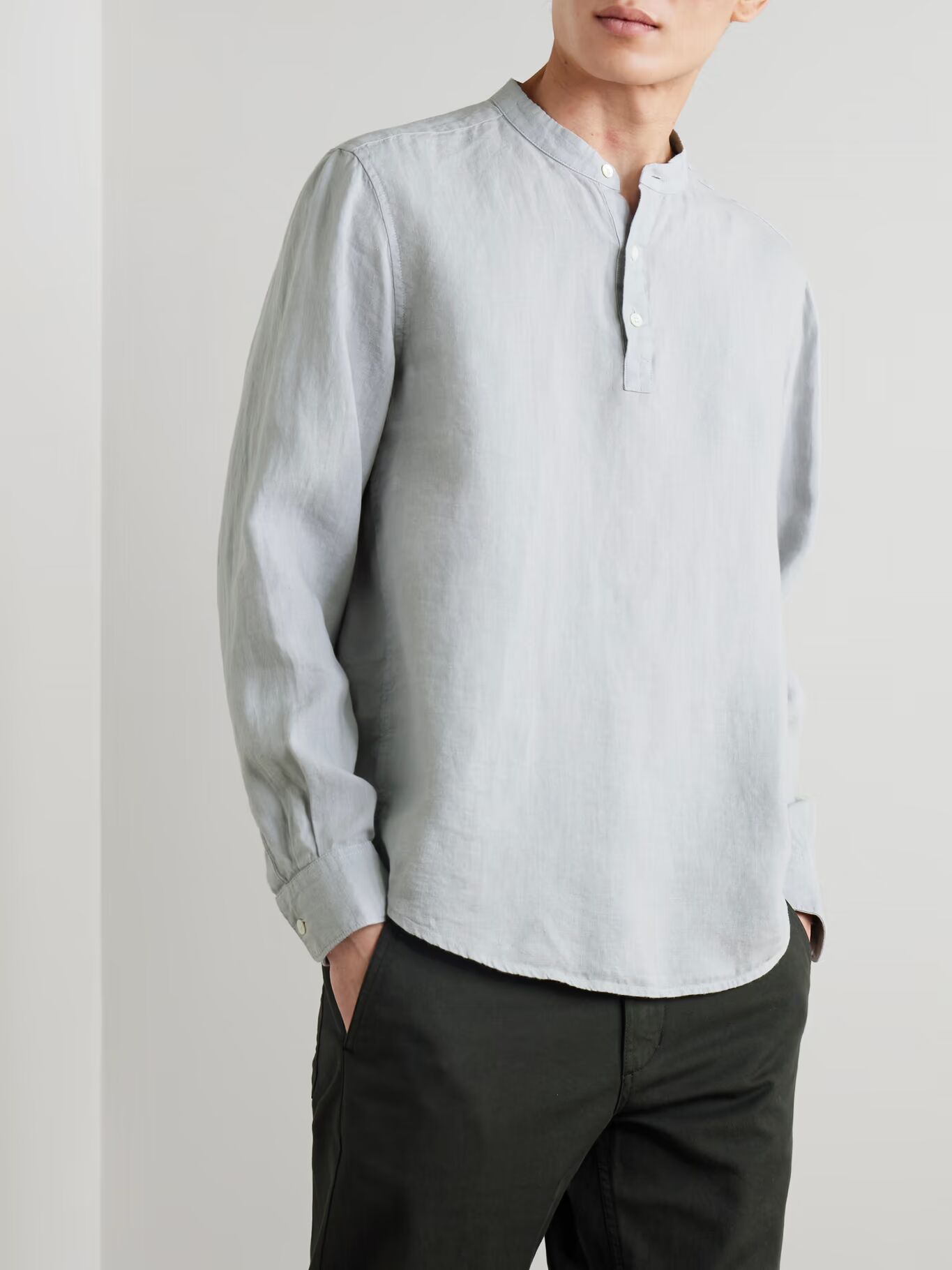 СОЗДАНО Г-НОМ ПОРТЕРОМ. Рубашка г-на П. станет отличным дополнением к вашему летнему гардеробу, так как она будет уместна на отдыхе или в городе. Взяв за основу кафтаны, она сшита из дышащего льна и имеет свободный воротник «дедушка».