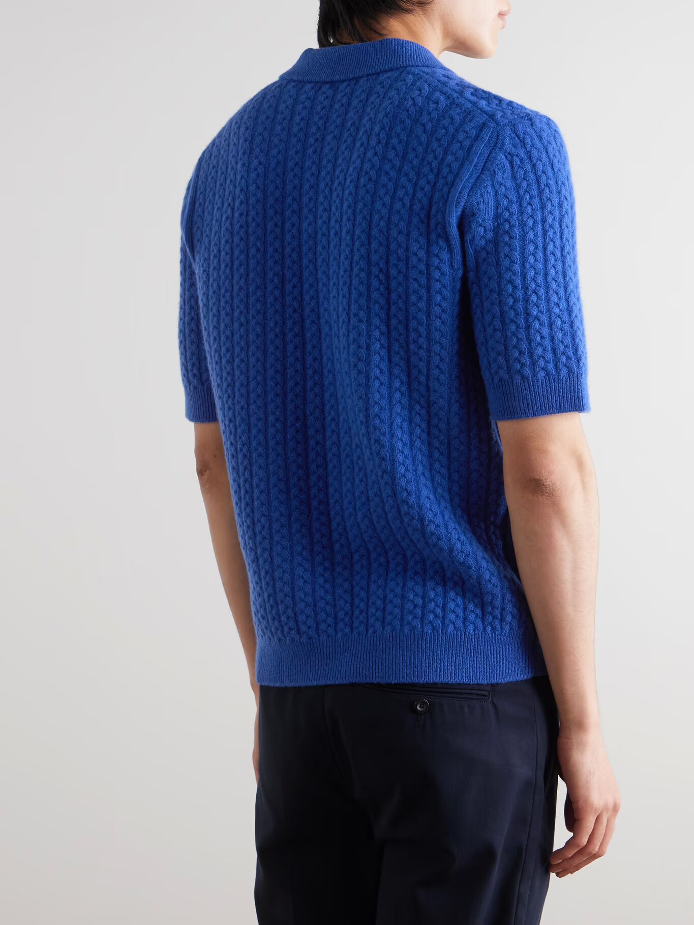 РАЗРАБОТАНО Г-НОМ ПОРТЕРОМ. Г-н П. привержен классике – эта рубашка-поло связана из шерсти в винтажном косичном плетении. У нее спущенные плечи, открытый воротник и ребристые отделки, поэтому она достигает баланса между элегантностью и непринужденностью.