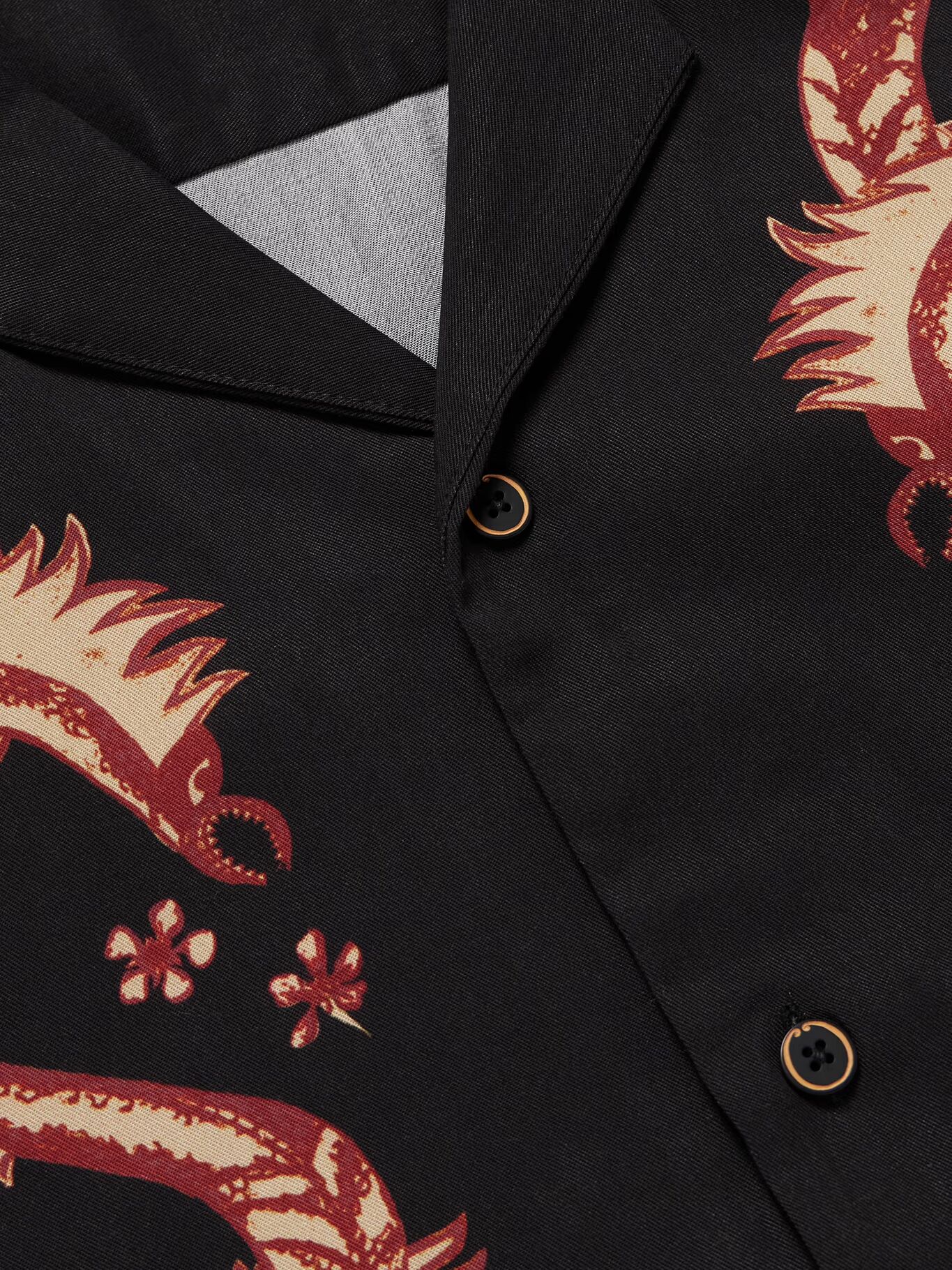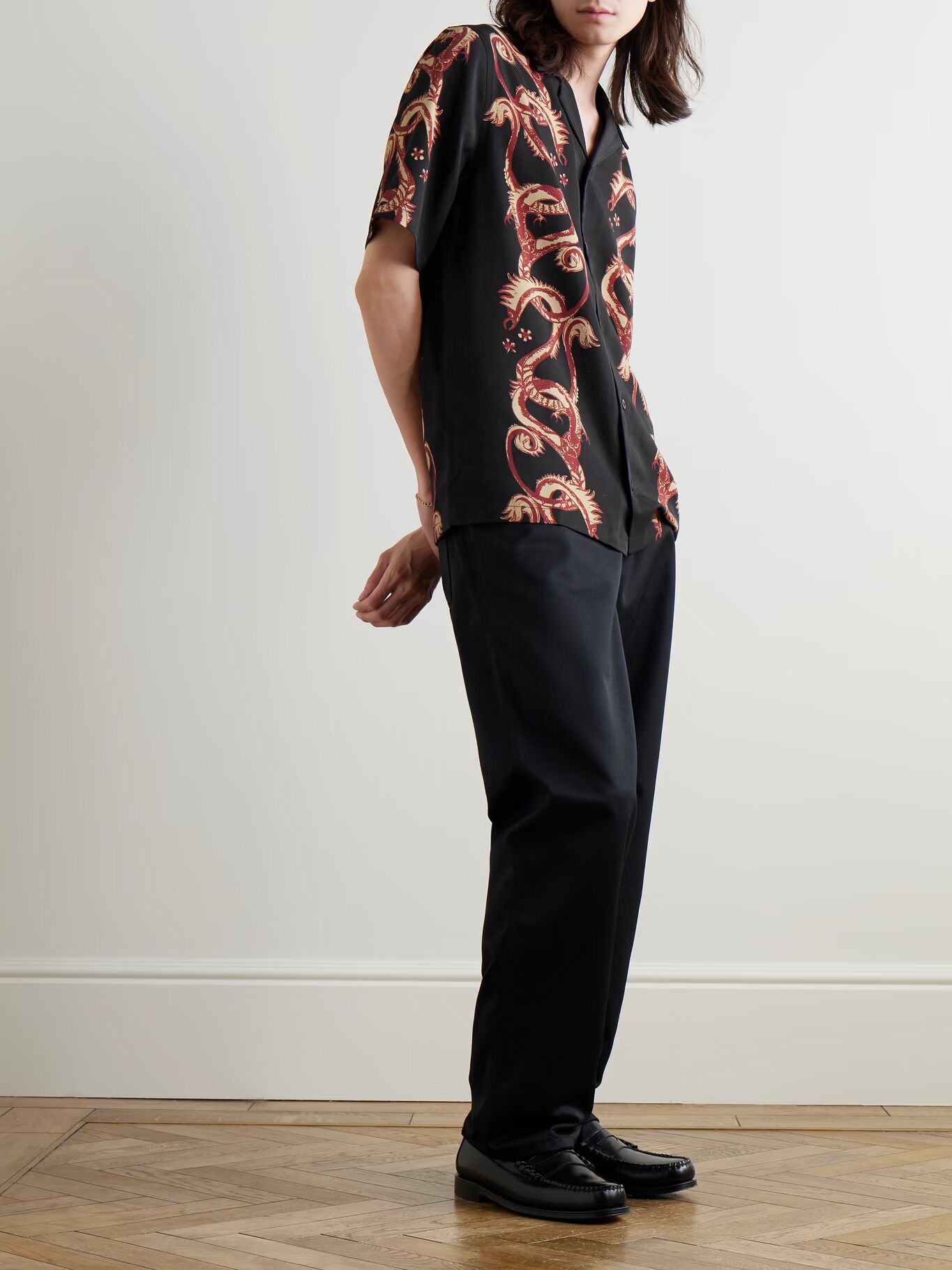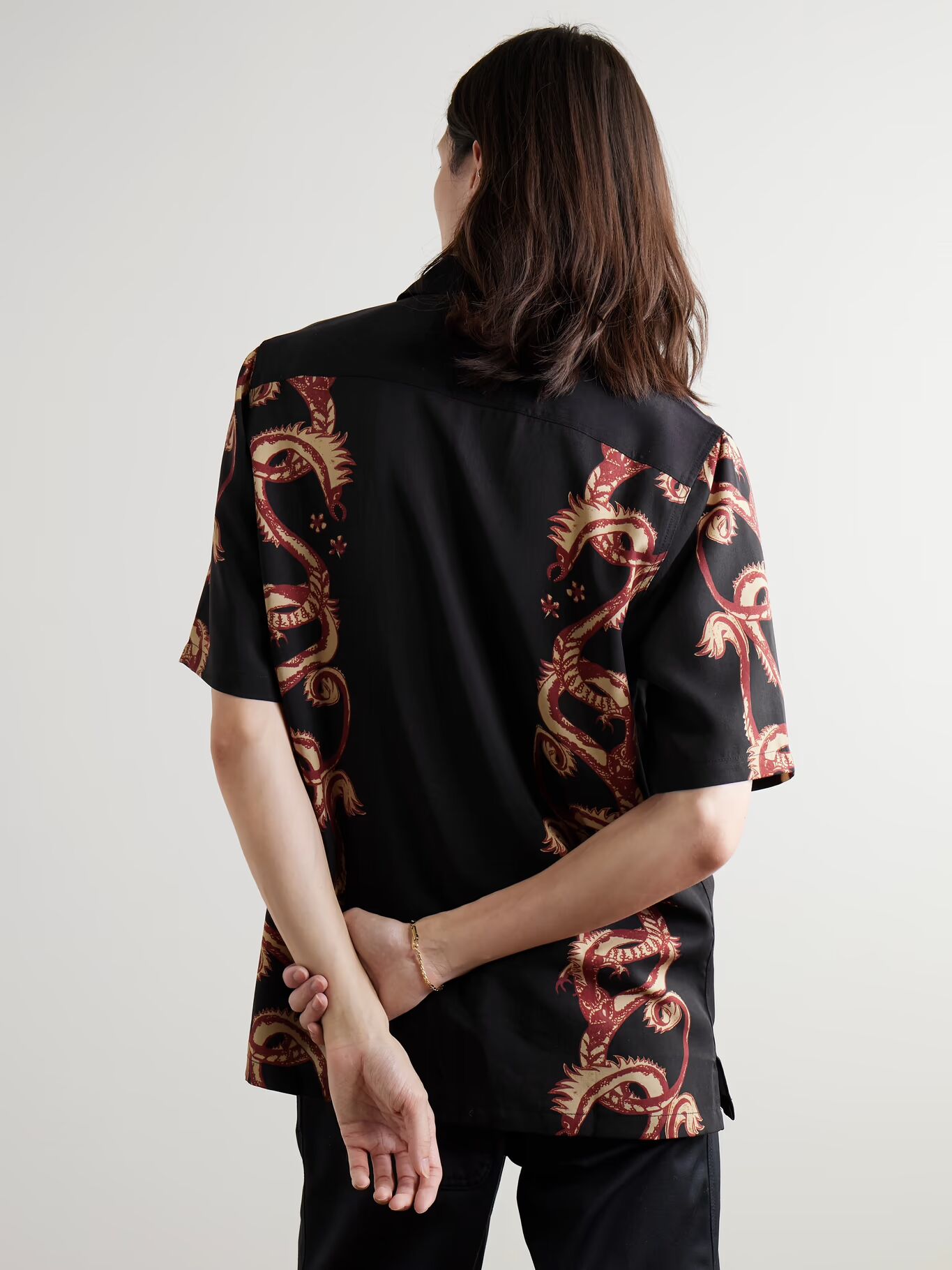 Дизайн Манааки переосмысливает традиционную символику маори. Эта рубашка украшена мифическими танивасами — сверхъестественными морскими существами, считающимися защитниками. Она сшита из гладкого твила лиоцелла и имеет свободный воротник-стойку.
