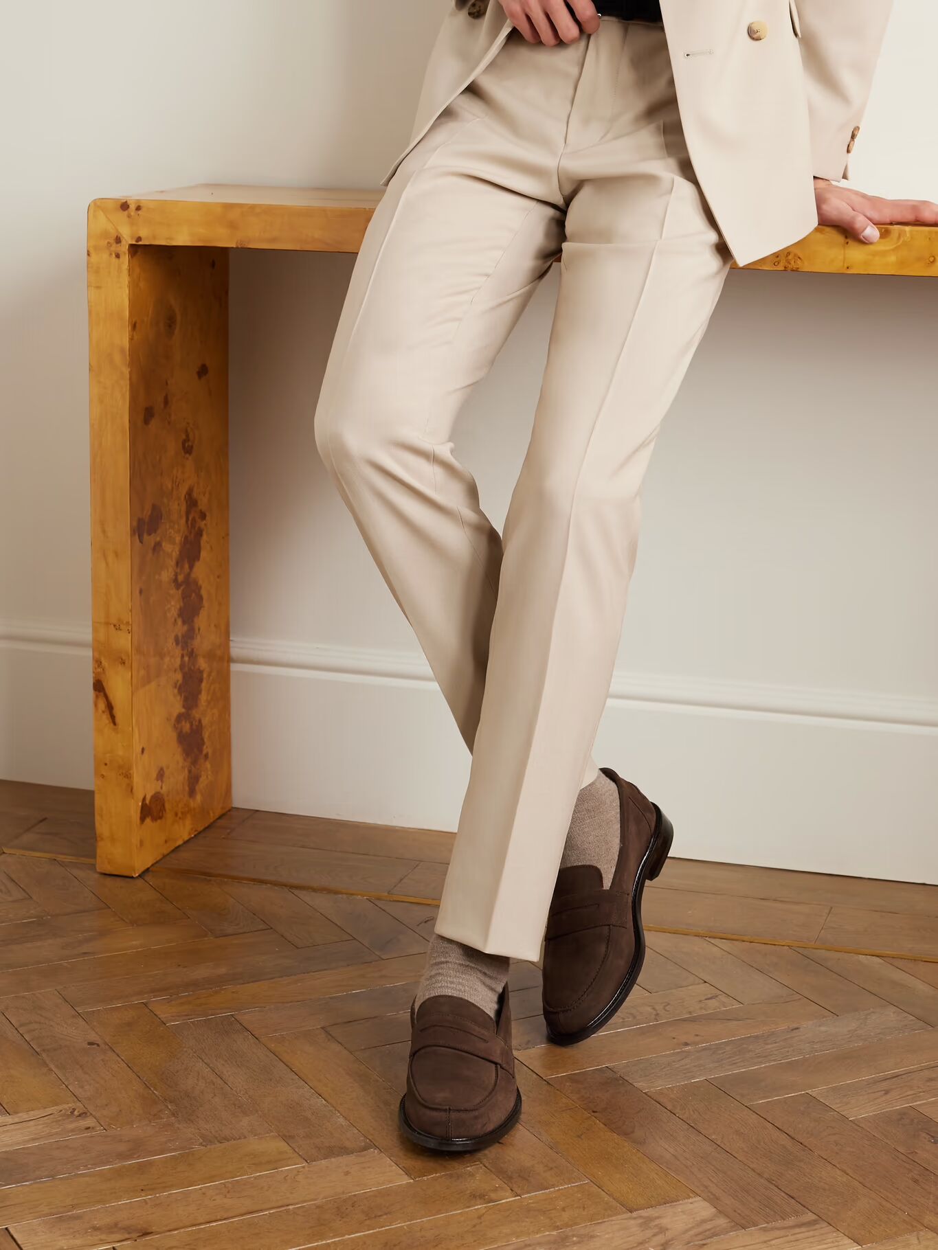 СОЗДАНО Г-НОМ ПОРТЕРОМ. Лоферы, отличающиеся универсальностью, отлично смотрятся с джинсами, брюками чинос, костюмами или шортами. Пара «Scott» г-на П. сделана из мягкой замши и установлена на кожаную подошву с резиновыми наконечниками. Слегка почистите их щеткой после носки, чтобы сохранить кожу.