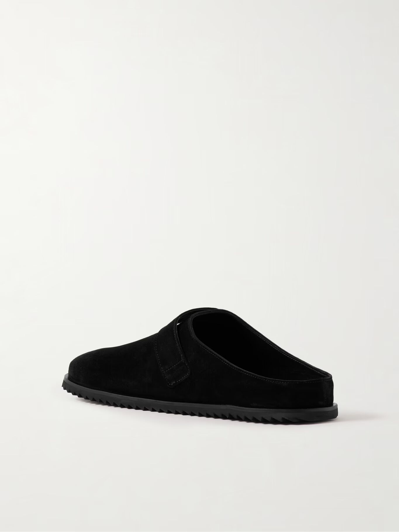 СОЗДАНО MR PORTER. Мюли Mr P., созданные для расслабленных дней, сделаны из черной замши. Они имеют закругленные носки и украшены пряжками серебристого тона по бокам.