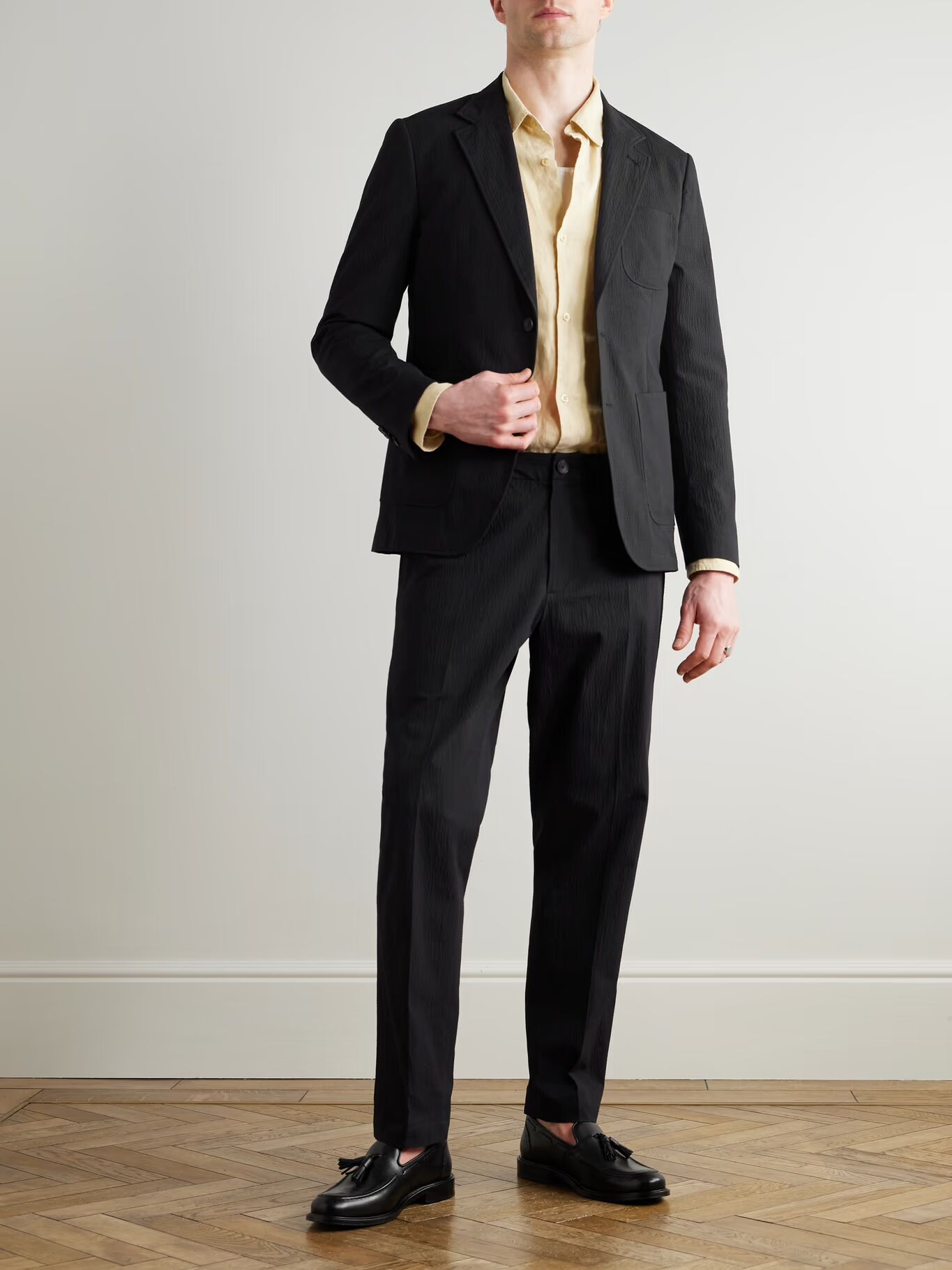 РАЗРАБОТАНО Г-НОМ ПОРТЕРОМ. Команда дизайнеров г-на П. увлечена качественным пошивом. Этот пиджак сшит из эластичного хлопкового сирсакера, что придает ему приятный элемент текстуры, и имеет накладные карманы для более непринужденного ощущения.