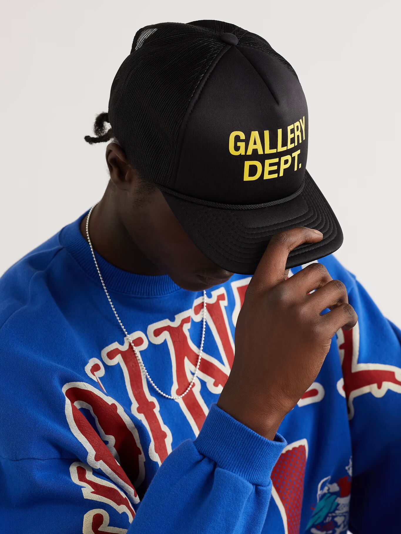 Рабочая одежда проникла в мужскую одежду с 1990-х годов, становясь более четкой, отполированной и изысканной. Кепка «Trucker» от Gallery Dept. сделана из черной пены и имеет дышащую сетчатую конструкцию. Спереди на ней напечатано смелое желтое название.