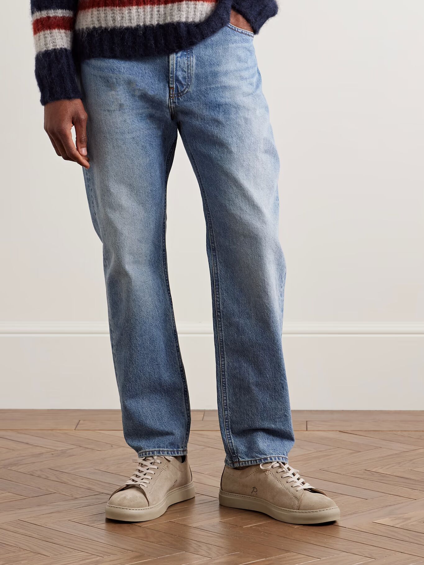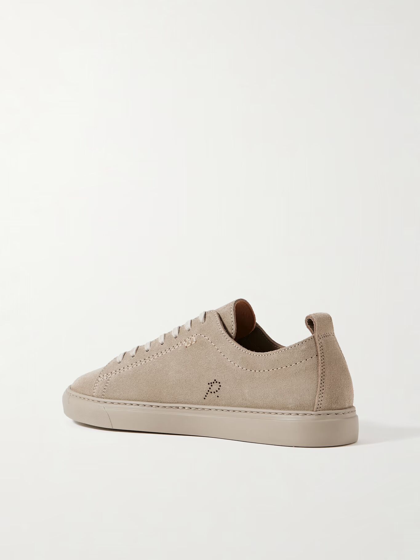 СОЗДАНО Г-НОМ ПОРТЕРОМ. Теннисные кроссовки г-на П. перфорированы фирменной буквой «P» вдоль подъема. Сделанные из гладкой замши, они сконструированы с тональной строчкой и установлены на резиновые подошвы с текстурой для сцепления.
