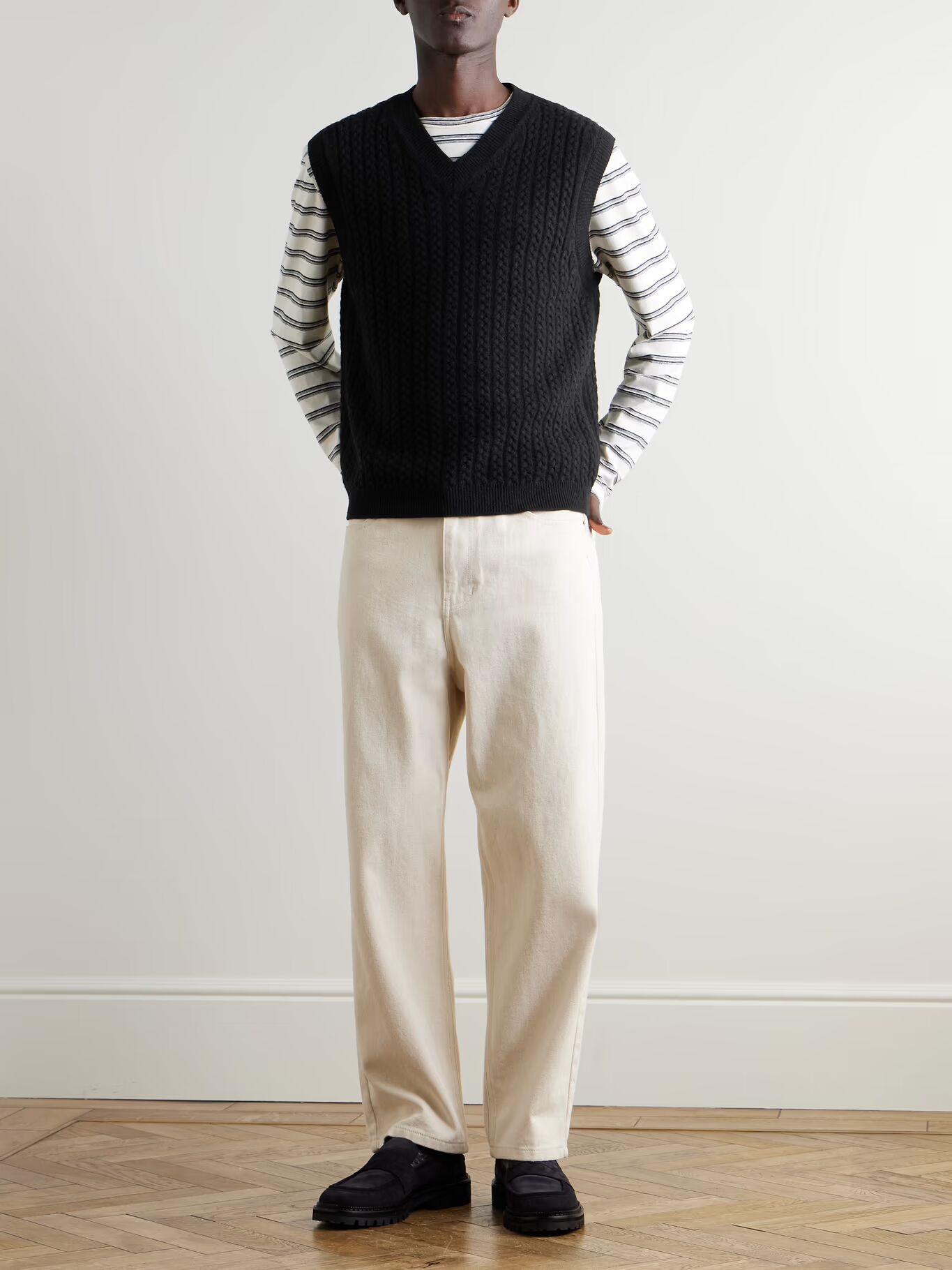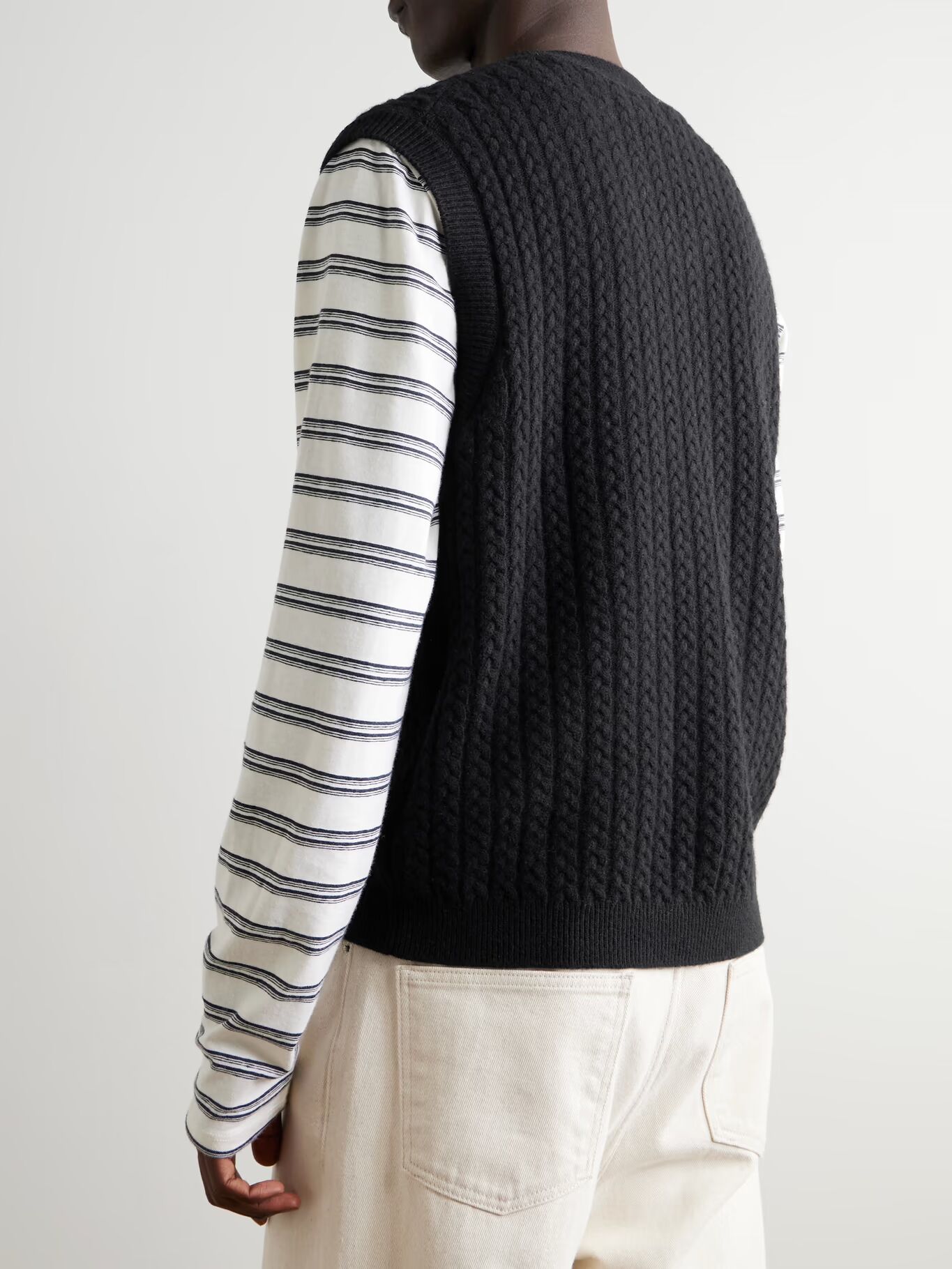 СОЗДАН ГОСПОДИНОМ ПОРТЕРОМ. Здесь, в Mr P., у нас есть довольно хороший архив, и многие из наших дизайнов вдохновлены недавним прошлым. Этот жилет-свитер связан из чистой шерсти толстым узором «косы». Носите его с футболкой для непринужденного образа студенческого стиля.