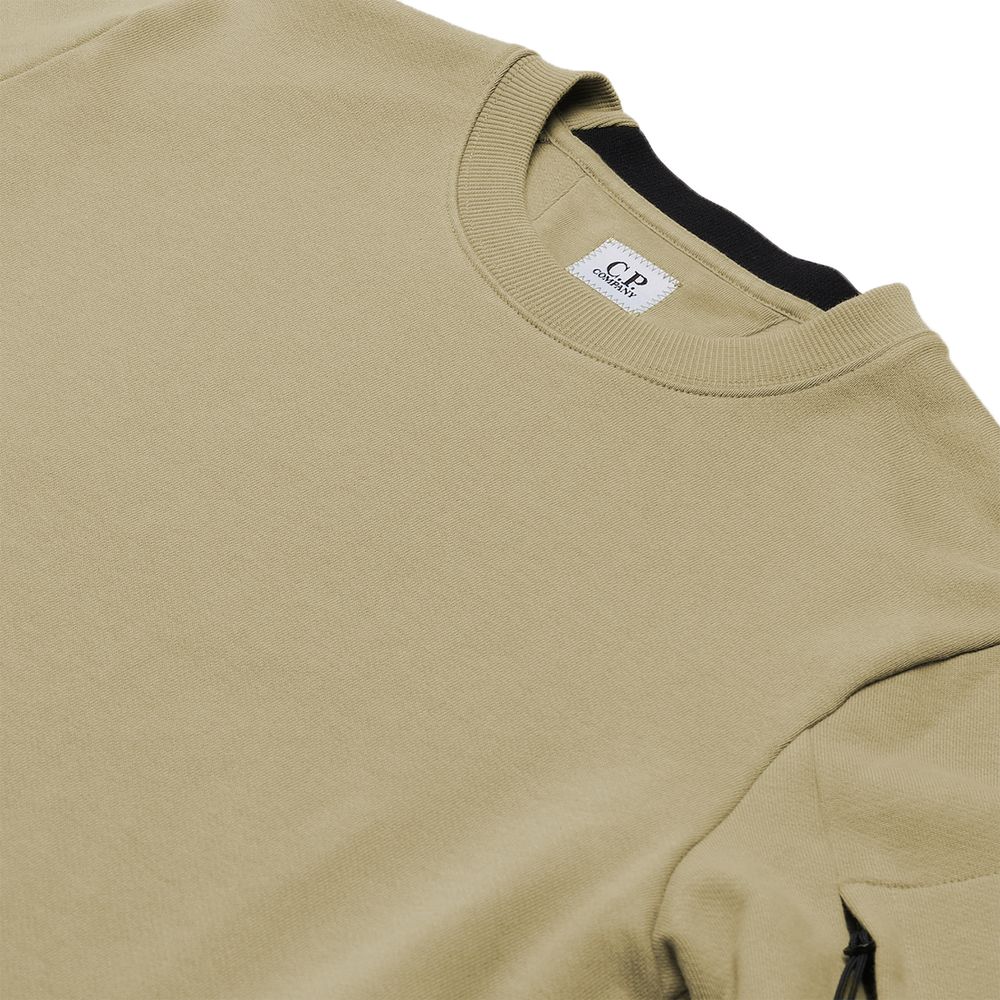 Толстовка cp Company из 100% хлопка бежевого цвета, с круглым вырезом, эластичным воротником, классическим кроем, карманом на молнии с левой стороны и фирменными очками.