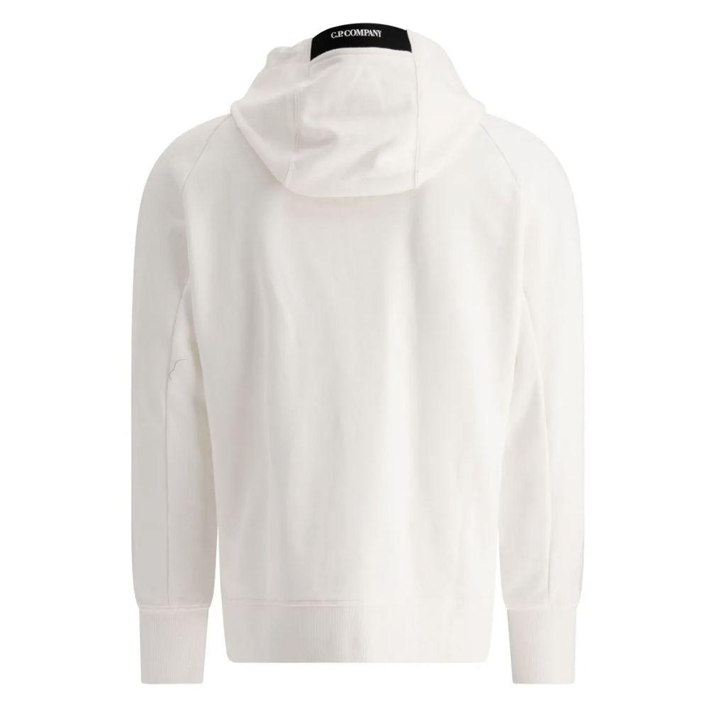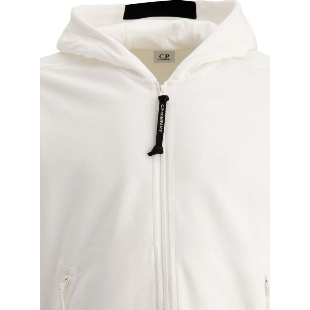 Толстовка cp Company из 100% хлопка белого цвета с капюшоном и эластичной резинкой, классического кроя, застежкой-молнией спереди и карманом на молнии с левой стороны, а также фирменными очками.