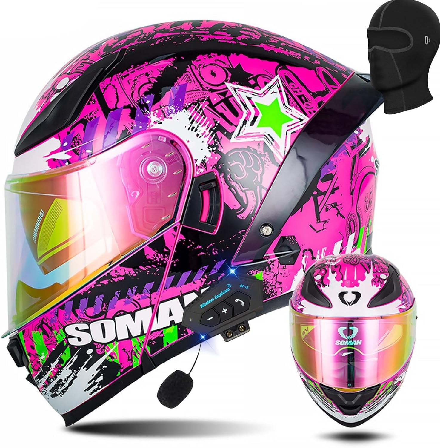 Откидной шлем для мотоцикла с Bluetooth. Встроенный усилитель мощности на чипе Bluetooth CSR5.0, стереобасовое объемное звучание, автоответчик, воспроизведение песен, встроенное FM-радио, активное шумоподавление для вызовов. Литий-полимерный аккумулятор, непрерывное прослушивание песен в течение 20 ч, режим ожидания 80 ч.