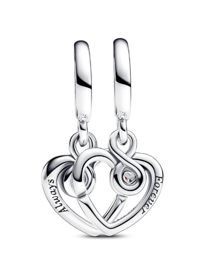 Отпразднуйте вечные узы с нашим шармом Forever & Always Splitable Dangle Charm, специальным изделием из чистого серебра. Два сердечка изящно переплетаются, образуя плавную форму, обрамленную сверкающим прозрачным кубическим цирконием. Выгравированный словами "Всегда" и "Навсегда", этот амулет говорит о непреходящей любви. Замысловатый дизайн выполнен в форме сердца с вырезом, который позволяет соединять два амулета вместе, символизируя вечные связи. Подарите половину кому-то особенному, кто постоянно присутствует в вашей жизни, в знак нерушимых уз.