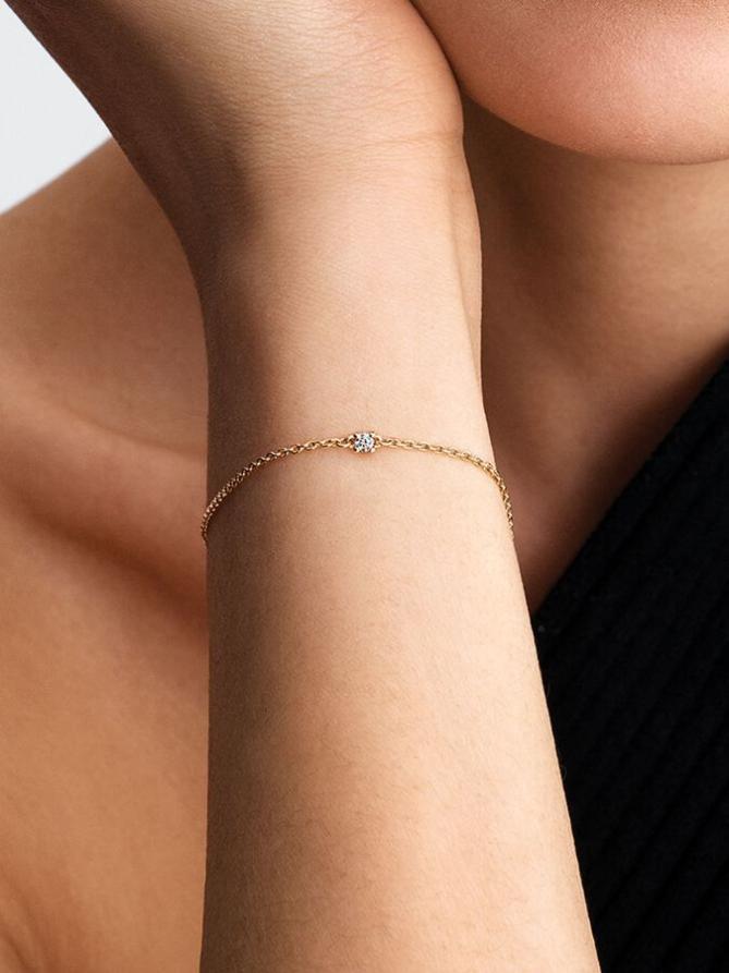 Познакомьтесь с вашим новым браслетом "I'm never taking it off". Регулируемая скользящая цепочка удобно облегает запястье, украшенная в центре бриллиантом круглой огранки 0,05 карата, выращенным в лаборатории. Это элегантное изделие сочетается со всем и придаст сияния каждому дню или особому случаю.
