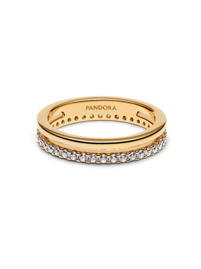 Сделайте выбор в пользу элегантной универсальности с кольцом с двойным ремешком. Двойной браслет с позолотой 14 карат оснащен одним полированным ремешком, параллельным второму, украшенному сверкающим паве. Две полосы кажутся отдельными, но на самом деле соединены, создавая эффектное сочетание различных текстур и материалов. Изящное, но эффектное, это кольцо с двойным ремешком теплых тонов займет излюбленное место в любой коллекции.