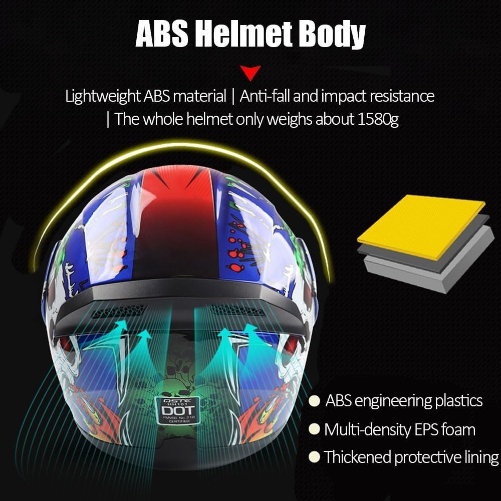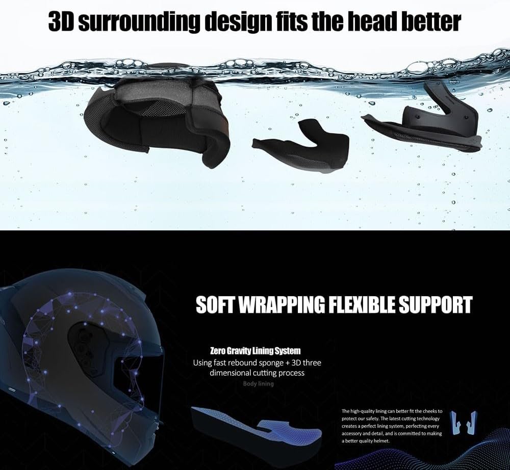 солнцезащитный козырек с зеркалом переднего вида и спортивный Дизайн: мотоциклетный шлем с двойным солнцезащитным козырьком, внешняя высокоточная противотуманная линза, внутренняя антибликовая, все солнцезащитные козырьки сменные и имеют покрытие против царапин. Система вентиляции аэродинамически спроектирована, чтобы помочь водителю оставаться прохладным и чувствовать себя комфортно. Обтекаемый дизайн эффективно снижает шум ветра.