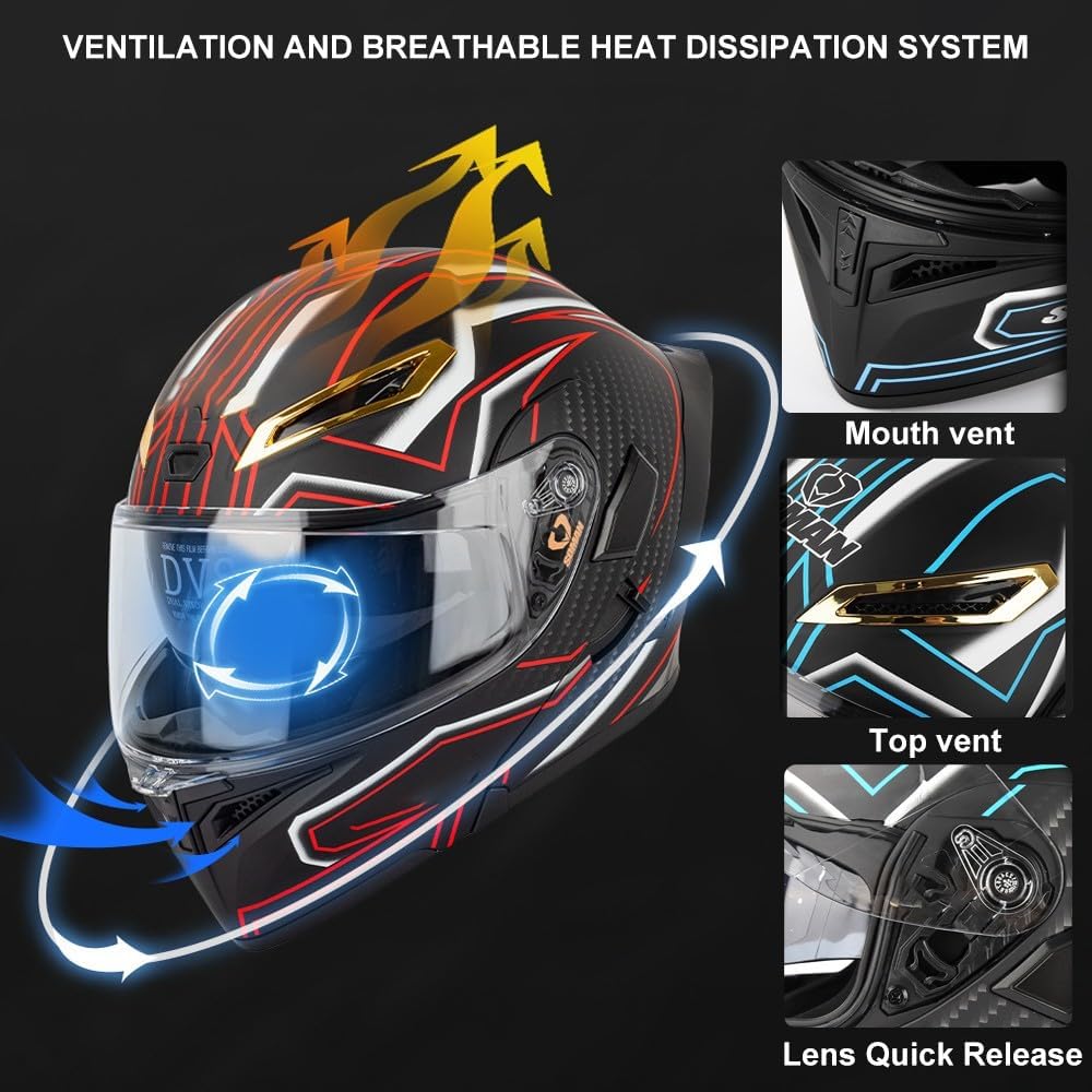 Сертифицированные мотоциклетные шлемы: Bluetooth-модульный откидной шлем для мотоцикла соответствует стандарту безопасности DOT FMVSS-218 и получил все сертификаты безопасности дорожного движения в Соединенных Штатах. Высокопрочная оболочка ABS и амортизирующий слой EPS могут эффективно защитить вашу безопасность, это важная часть оборудования для ваших поездок на открытом воздухе.