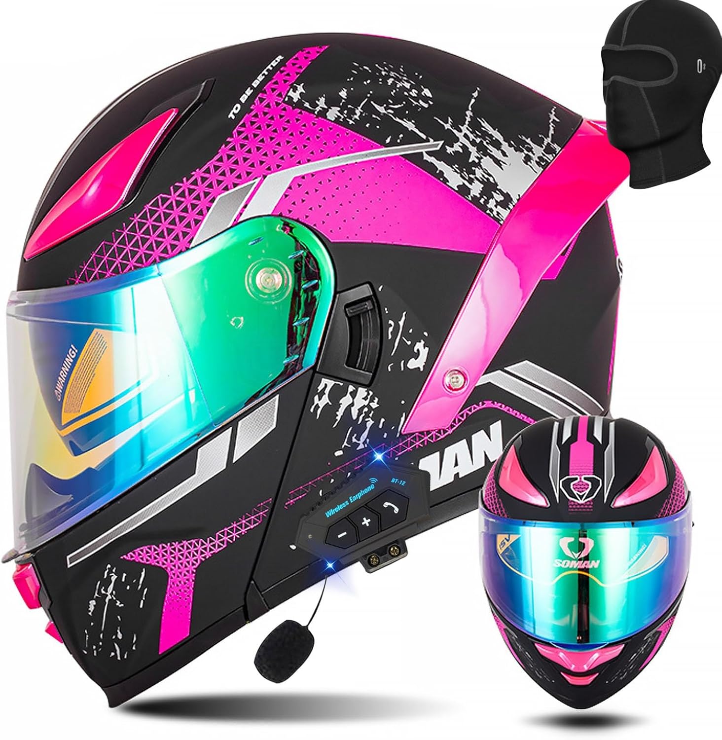 Откидной шлем для мотоцикла с Bluetooth. Встроенный усилитель мощности на чипе Bluetooth CSR5.0, стереобасовое объемное звучание, автоответчик, воспроизведение песен, встроенное FM-радио, активное шумоподавление для вызовов. Литий-полимерный аккумулятор, непрерывное прослушивание песен в течение 20 ч, режим ожидания 80 ч.