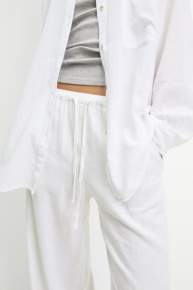 Свободные брюки-джоггеры с эластичным поясом, завязкой на шнурке и карманами. Изготовлено из смеси вискозы (71%) и льна (29%).