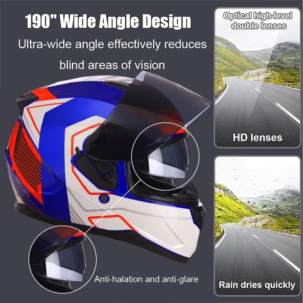Система визора: Ощутите сверхширокий обзор на 190° через устойчивую к царапинам внешнюю линзу HD + встроенный выдвижной затемненный внутренний визор. Аэродинамическая система вентиляции (3 регулируемых вентиляционных отверстия) сохраняет поток воздуха свежим летом, предотвращая запотевание зимой. Отвечает требованиям гонщиков "casco para moto con Bluetooth" по адаптации к климату.