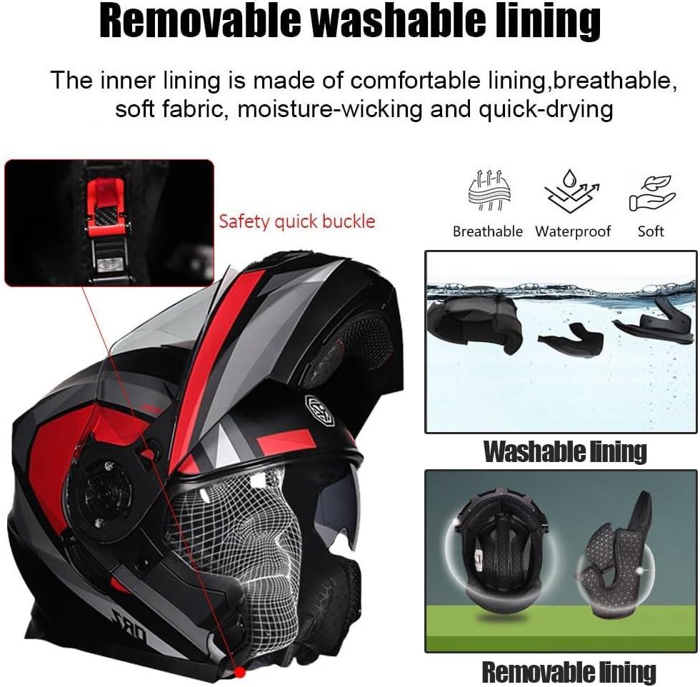 козырьки и быстросъемная пряжка: откидные мотоциклетные шлемы с внутренней солнцезащитной линзой с защитой от ультрафиолета и ударопрочным, износостойким внешним экраном могут эффективно снизить воздействие ультрафиолетовых лучей на очки, позволяя вам легко справляться с воздействием различного окружающего освещения. Быстросъемная пряжка на регулируемом подбородочном ремешке позволяет легко надевать и снимать шлем для вашего удобства.
