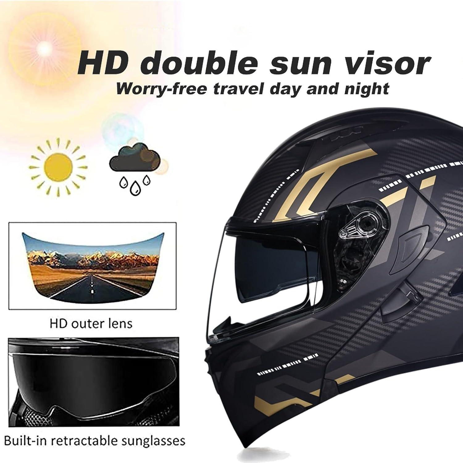 широкое поле зрения и прозрачный солнцезащитный козырек. Внутренний солнцезащитный козырек: передний солнцезащитный козырек прочный и эластичный, имеет отличную ударопрочность; внутренний темный солнцезащитный козырек может дополнительно защищать глаза от солнца и может легко управляться переключателем.