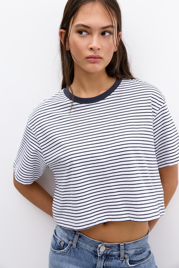 Укороченная футболка с короткими рукавами и круглым вырезом. Изготовлено из 100% хлопка.
