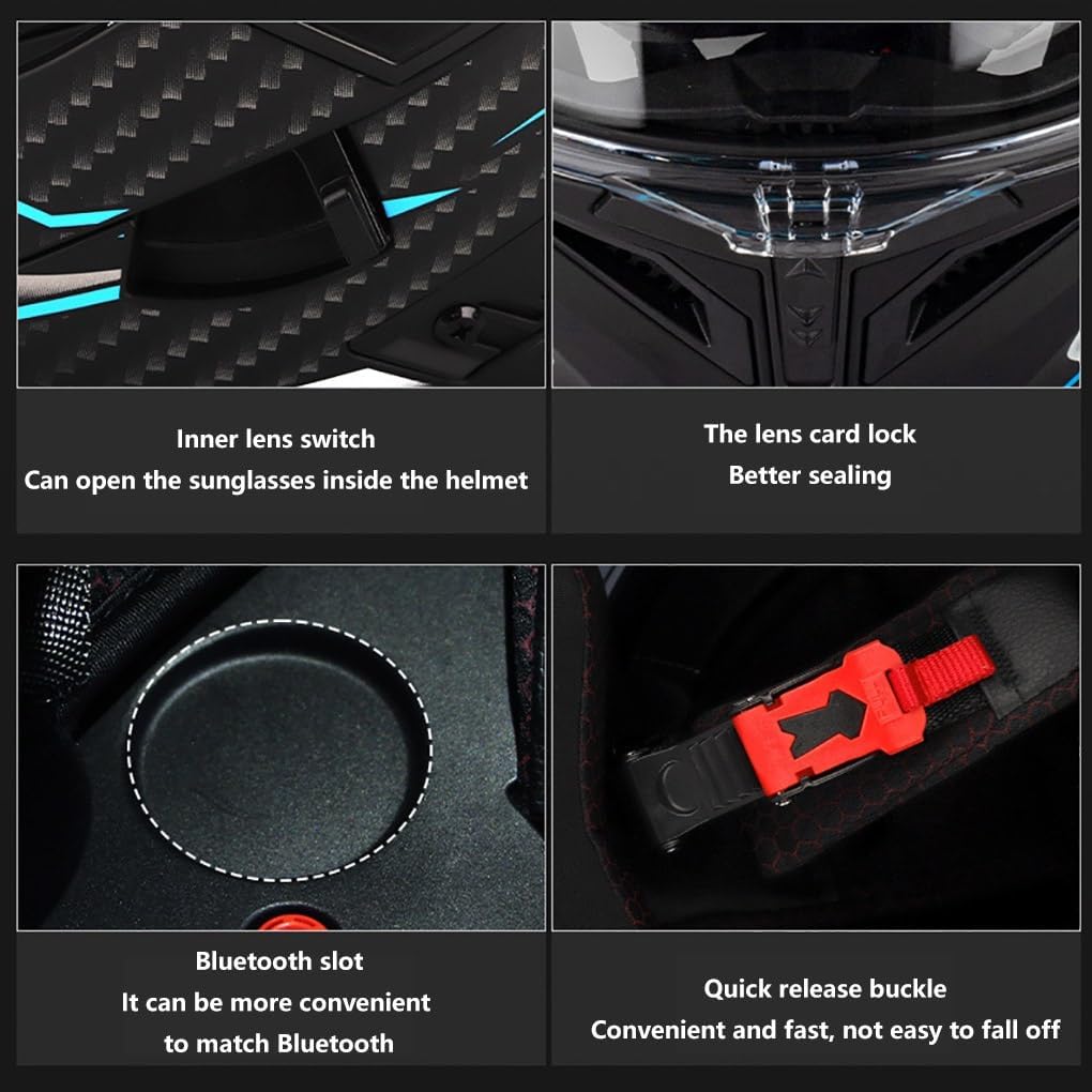 Мощная функция Bluetooth: мотоциклетный шлем Bluetooth версии 5.3 предлагает вам 24-36 часов разговора. Управление одним касанием позволяет легко отвечать на звонки или слушать музыку.
