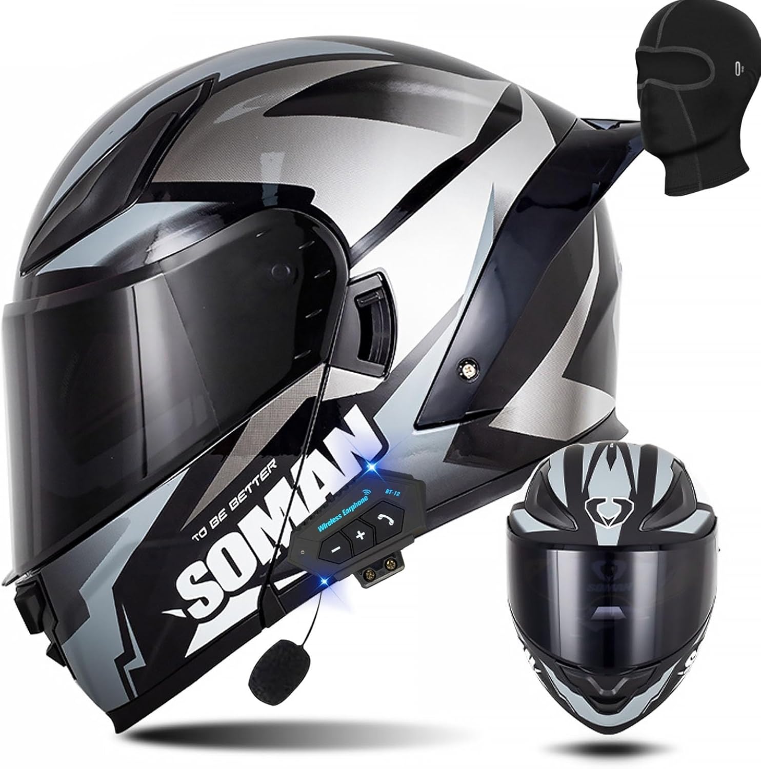 Откидной шлем для мотоцикла с Bluetooth. Встроенный усилитель мощности на чипе Bluetooth CSR5.0, стереобасовое объемное звучание, автоответчик, воспроизведение песен, встроенное FM-радио, активное шумоподавление для вызовов. Литий-полимерный аккумулятор, непрерывное прослушивание песен в течение 20 ч, режим ожидания 80 ч.