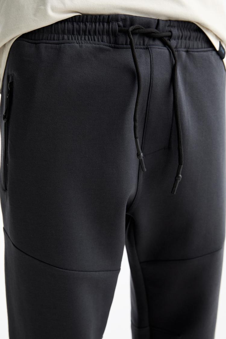 Технический спортивный костюм с карманами на молнии по бокам и эластичным поясом на шнурке. Доступно в разных цветах. Изготовлено из эластичной ткани интерлок.