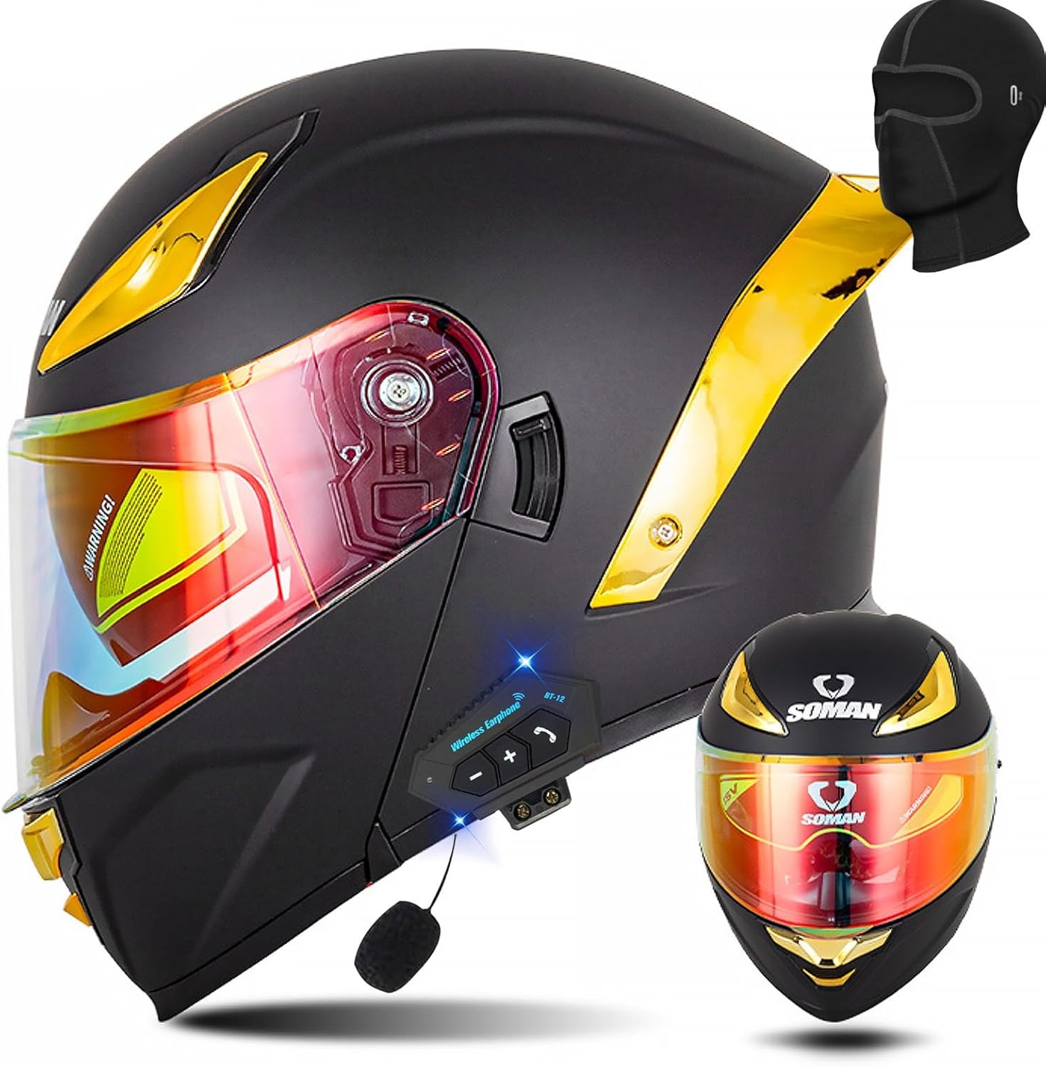 Откидной шлем для мотоцикла с Bluetooth. Встроенный усилитель мощности на чипе Bluetooth CSR5.0, стереобасовое объемное звучание, автоответчик, воспроизведение песен, встроенное FM-радио, активное шумоподавление для вызовов. Литий-полимерный аккумулятор, непрерывное прослушивание песен в течение 20 ч, режим ожидания 80 ч.