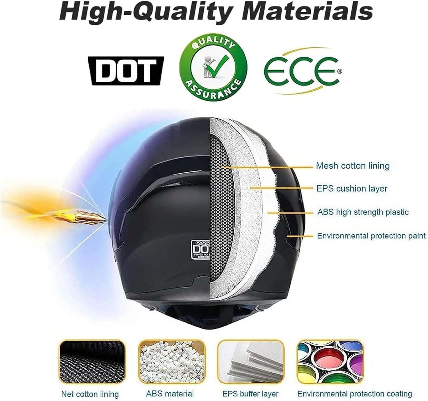 Сертификация безопасности шлема: Bluetooth-модульный мотоциклетный шлем соответствует стандарту безопасности DOT FMVSS 218 и получил все сертификаты безопасности дорожного движения в Соединенных Штатах. Высокопрочная оболочка ABS и амортизирующий слой EPS могут эффективно защитить вашу безопасность, это важная часть оборудования для ваших поездок на открытом воздухе.