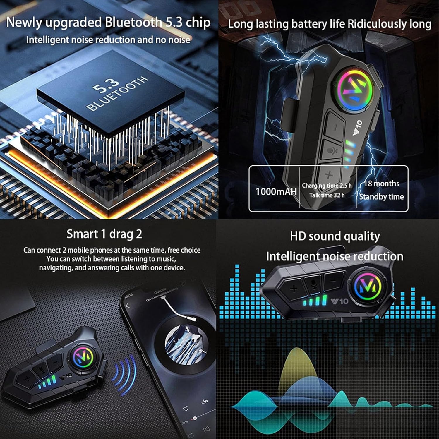 Bluetooth + Микрофон Откидной передний шлем для мотоцикла с Bluetooth Встроенный Bluetooth Чип Bluetooth 5.3, интеллектуальное шумоподавление, сверхдлительное время автономной работы, большая емкость 1000 мАч, 20 минут зарядки, 3 часа автономной работы, 18 месяцев в режиме ожидания 32 часа непрерывного воспроизведения. Smart 1-to-2, может подключать 2 мобильных телефона одновременно. Вы можете переключаться между прослушиванием музыки, навигацией и приемом звонков с помощью одного устройства. Глубоко водонепроницаемый.