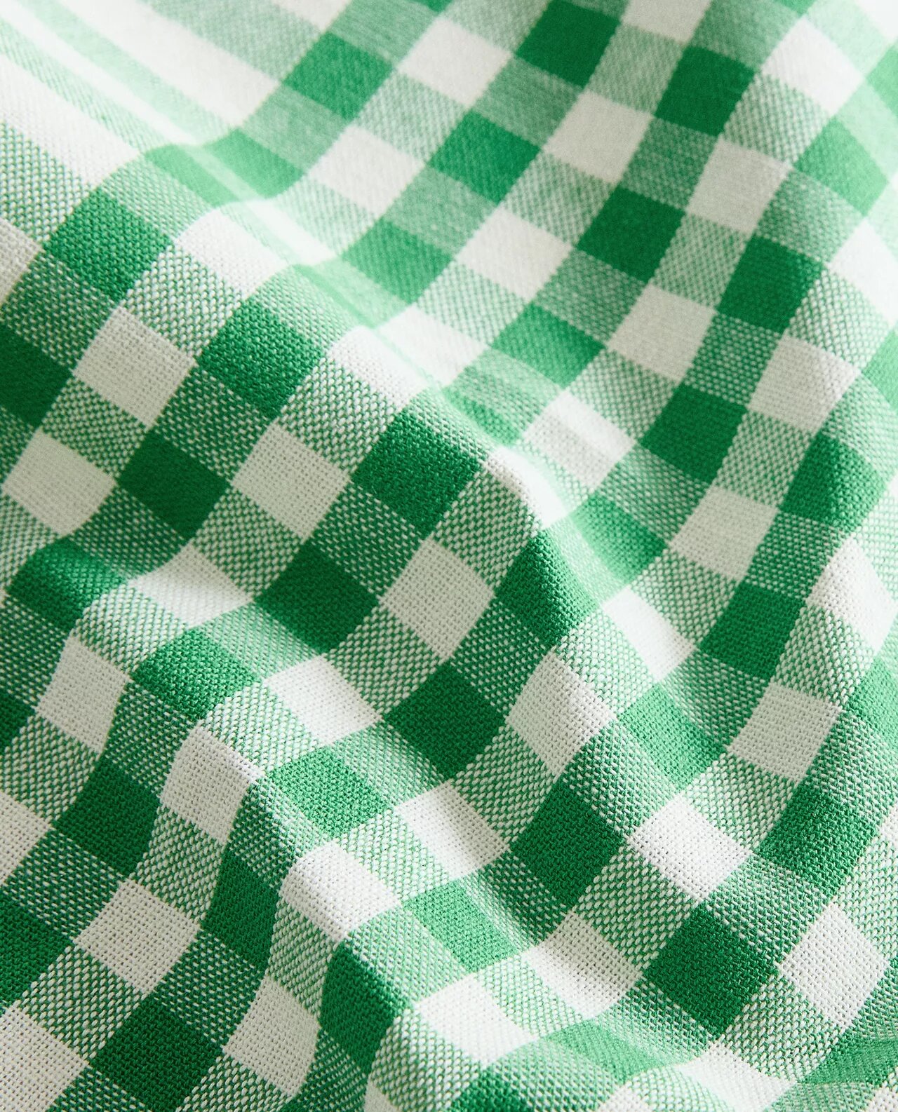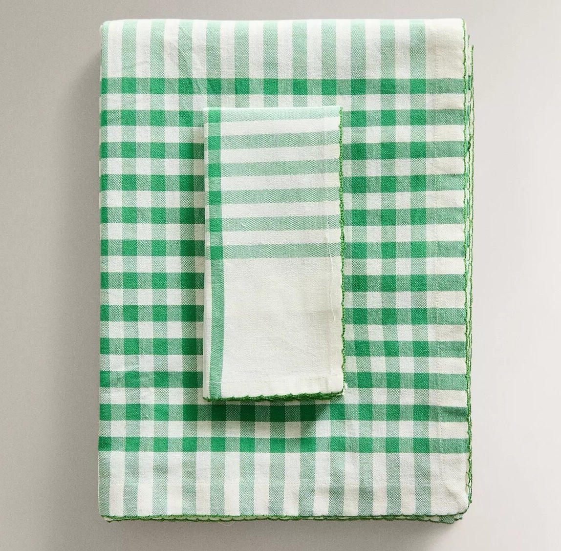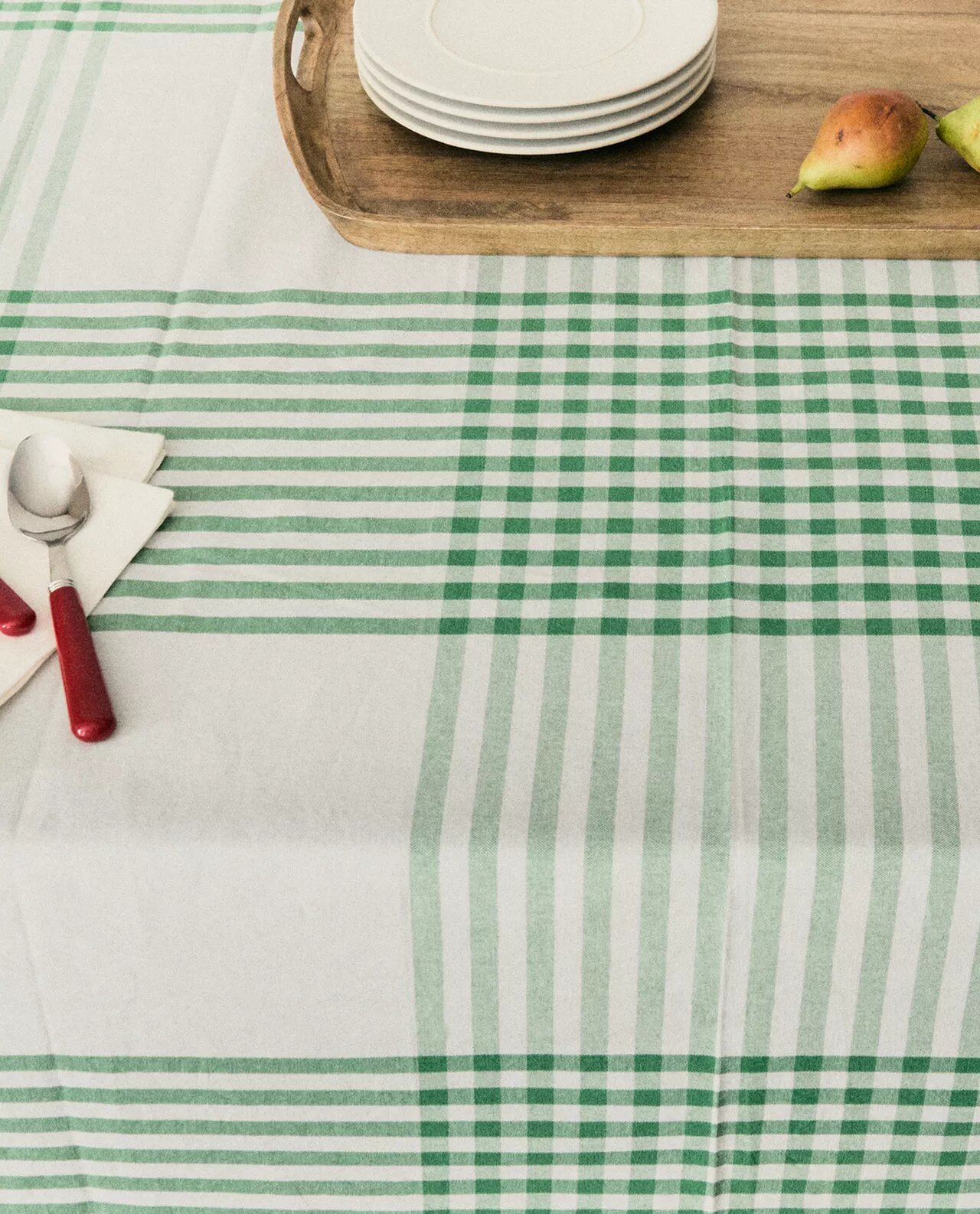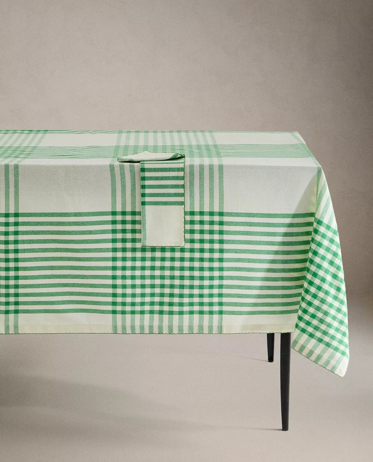 Эта скатерть сшита из окрашенной хлопчатобумажной нити, а рисунок в клетку делает ее нарядной для любого застолья.