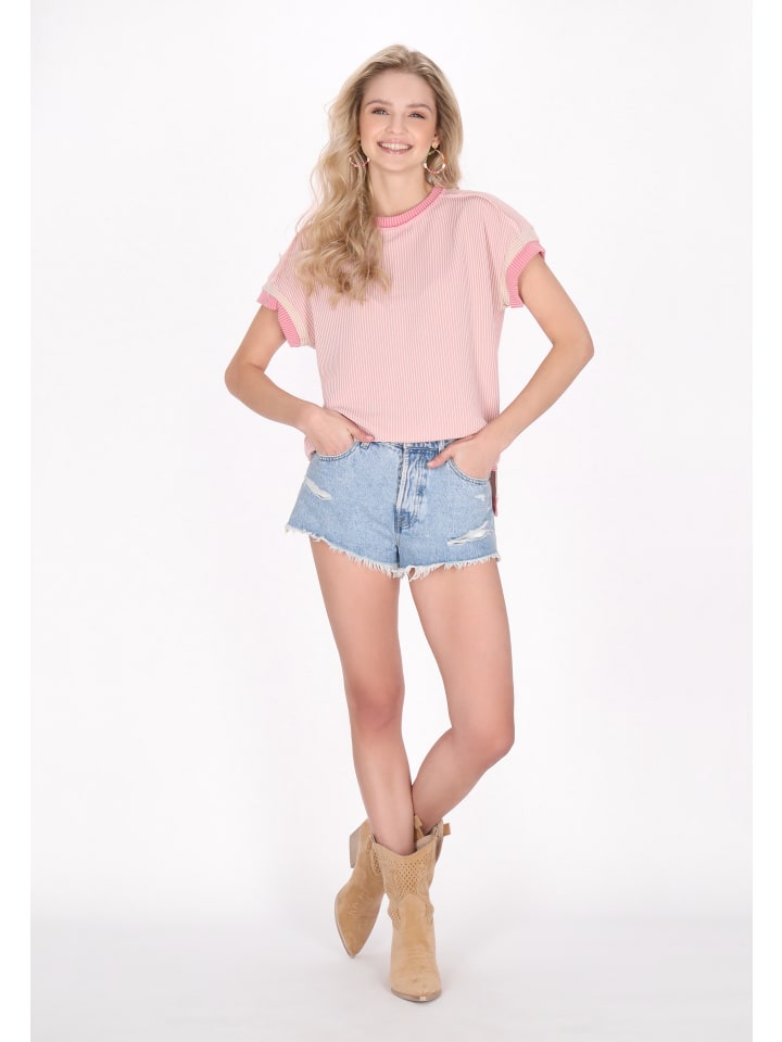 Поднимите свой повседневный стиль с этой повседневной футболкой с круглым вырезом и ребристой текстурой для дополнительной глубины. Короткие рукава, которые слегка закатаны, добавляют изюминки, в то время как удлиненная спинка подчеркивает современный силуэт. Идеально сочетается с джинсовыми шортами, воплощает непринужденные летние настроения, идеально подходящие для повседневных выходов. Эта футболка является частью коллекции Fashion Look.
