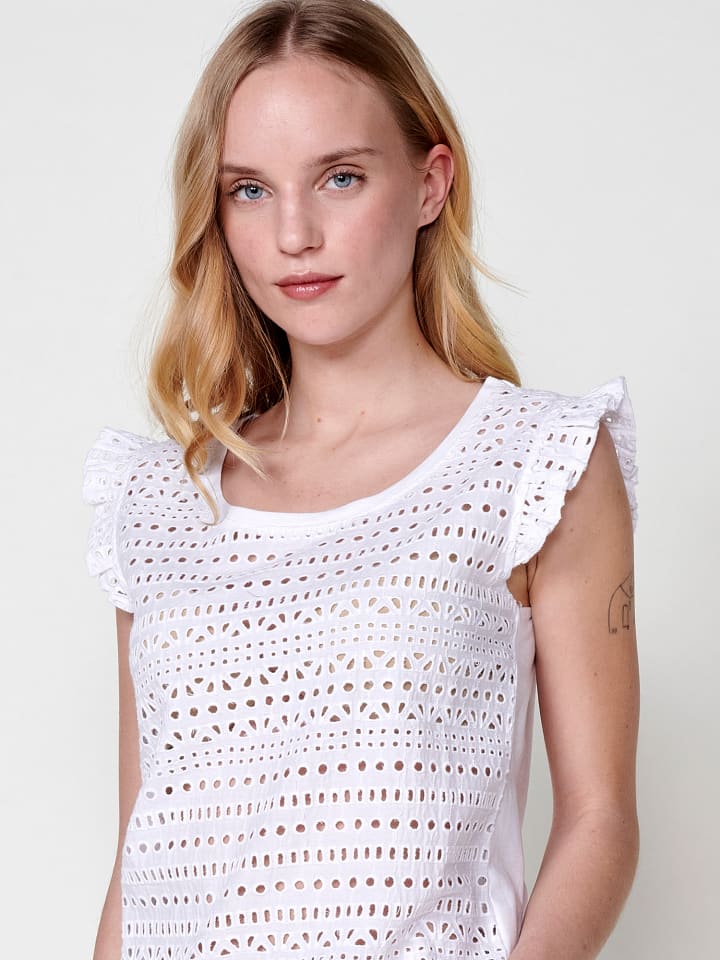 Футболка с короткими рукавами, оборками и круглым вырезом. Перед и рукава выполнены из английской вышивки. Спинка из фактурной ткани. Металлическая пластина с логотипом Koroshi спереди. Состав: 100% хлопок.