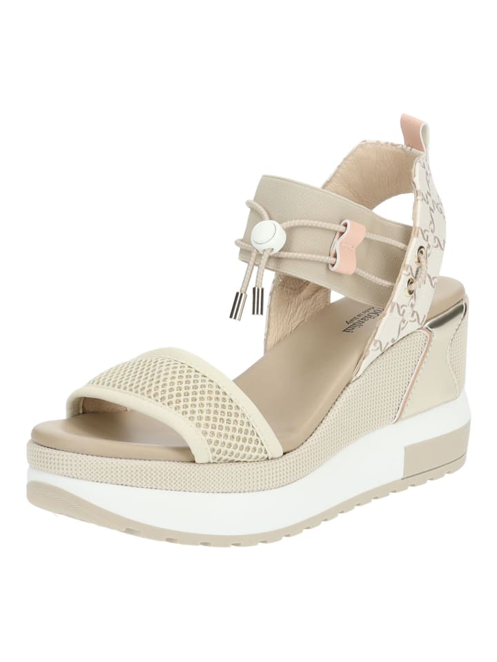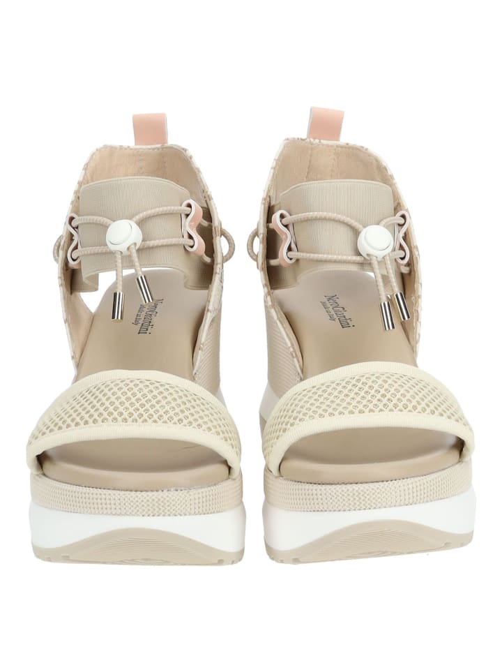 Великолепные босоножки на танкетке от Nero Giardini, выполненные из смеси искусственной кожи и текстиля. Танкетка и контрастные ремешки придают босоножкам современный вид. Кроме того, быстрая шнуровка и эластичная резинка облегчают надевание и снятие. - Застежка: Туфли-лодочки