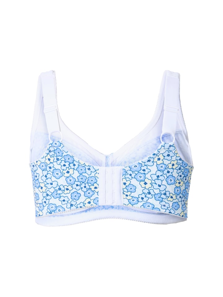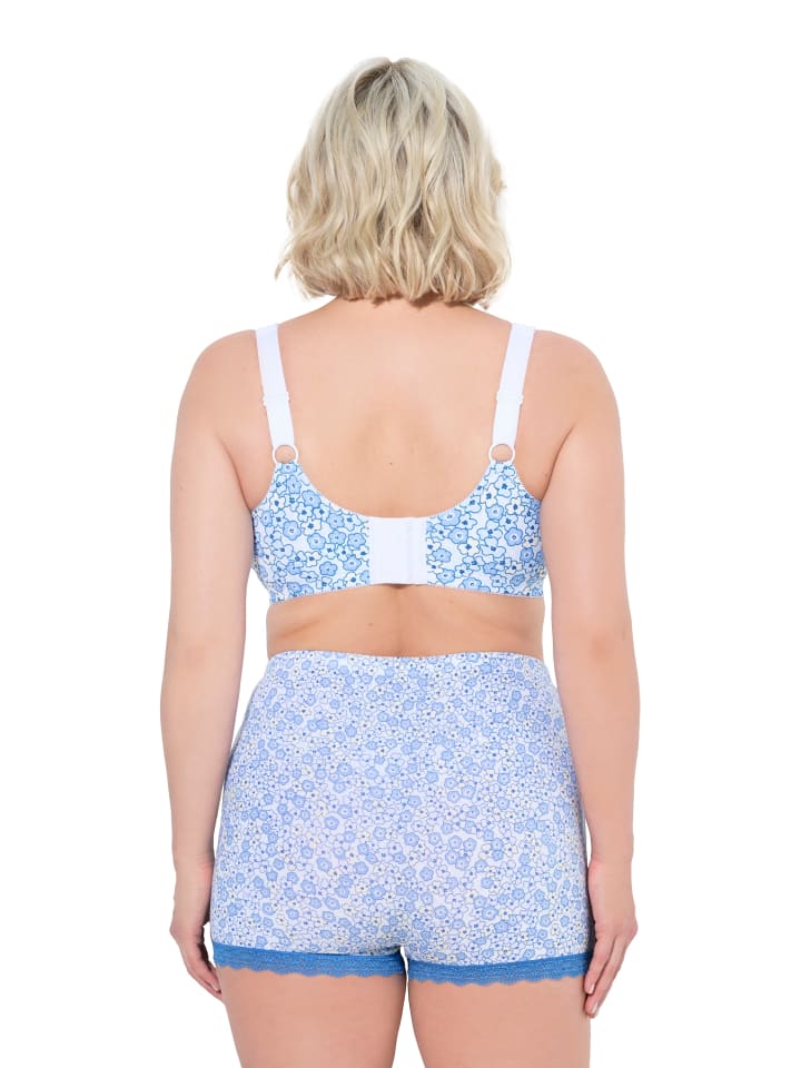 Поддерживающий бюстгальтер без косточек. С синим цветочным узором и широкими, мягкими и регулируемыми бретелями.