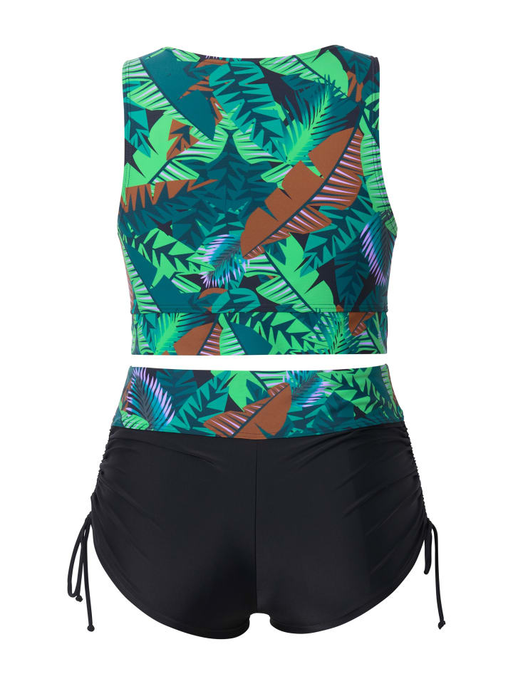 Бикини, раздельный, с мягкими чашечками, шортиками и принтом в виде пальм. Удлиненный топ с драпировкой и декоративными пряжками. Поддерживающая резинка под грудью, подкладка спереди. Подходящие шорты с широким поясом и декоративными бантами по подолу. Изготовлено из переработанного полиамида. OEKO-TEX.