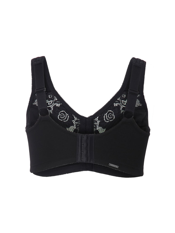Поддерживающий бюстгальтер без косточек, с практичной застежкой спереди. Приятная на ощупь хлопковая ткань с кружевной отделкой по вырезу горловины.