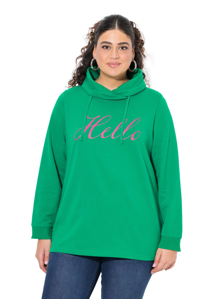 Свитшот, удобный классический крой, из мягкого трикотажа с надписью HELLO. Широкий воротник-стойка с завязкой. Длинные рукава, ребристые манжеты. Боковые разрезы для еще большего комфорта.