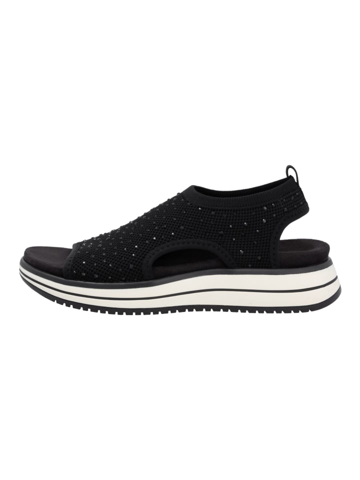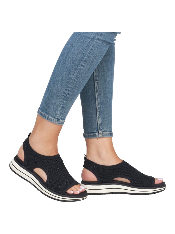 Эти летние, легкие босоножки с голенищем от Remonte — абсолютный must-have наступающего сезона. Эту модель отличает дышащий текстиль и сверкающие камни. Удобная текстильная подошва обеспечивает идеальный климат для ног. Эти сандалии будут универсальны, независимо от того, сочетаются ли они с джинсами, платьем или юбкой. - Застежка: Туфли-лодочки