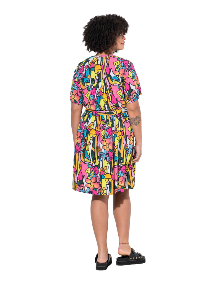 Платье А-силуэта из мягкой вискозы с принтом по всей поверхности. Туниковый вырез с застежкой на пуговицы, эластичная талия с завязкой — всегда желаемый силуэт. Рукав до середины.