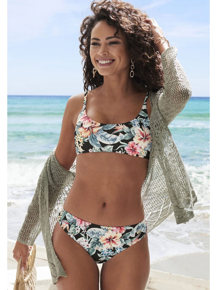 С цветочным принтом по всей поверхности: бюстье-топ бикини от Lascana. Каждое изделие уникально. Мягкие чашки съемные, бретели регулируются. Из серии «Микс-Кини». Мягкое качество с переработанным полиамидом.