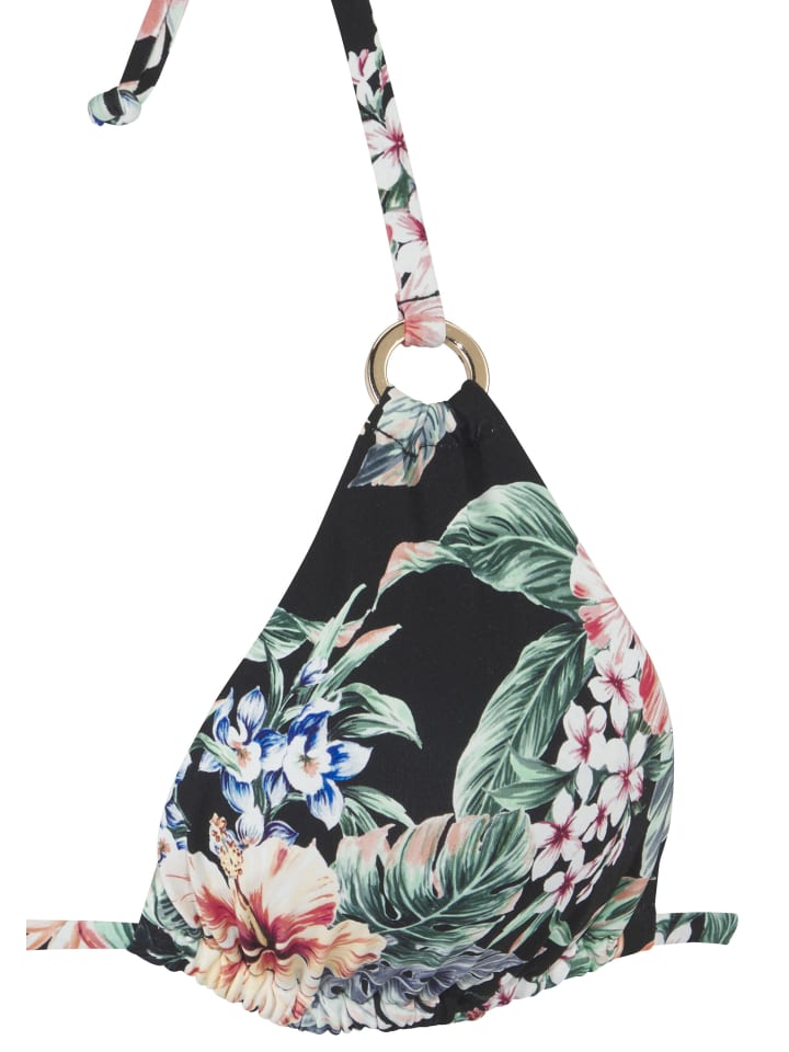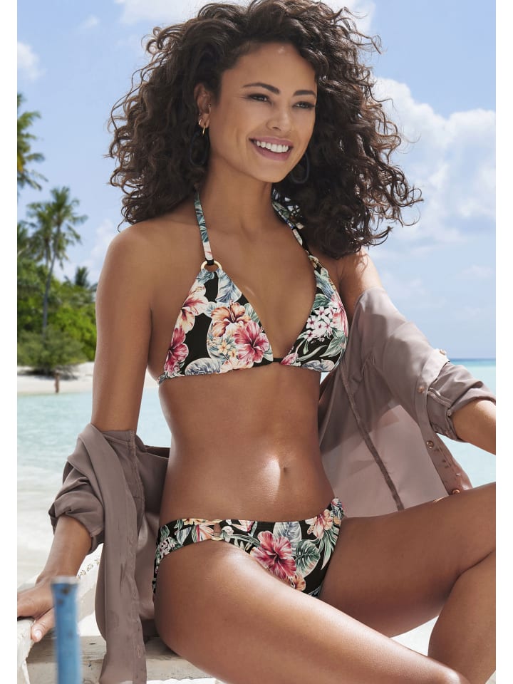 Красивый треугольный верх бикини от Lascana с цветочным принтом — каждое изделие уникально. С декоративными кольцами в блестящем виде. Съемные мягкие чашки. Из серии «Микс-Кини». Приятное качество с переработанным полиамидом.